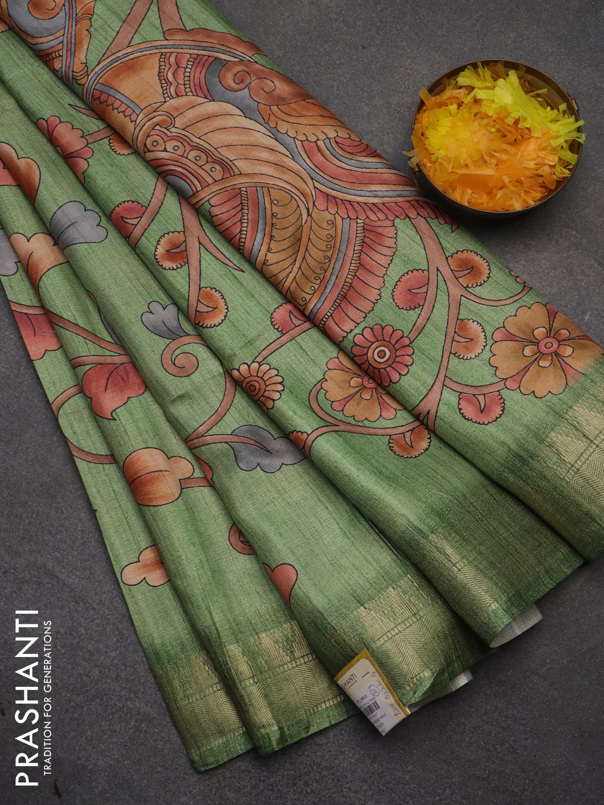 Semi tussar saree green with allover floral prints and zari woven border