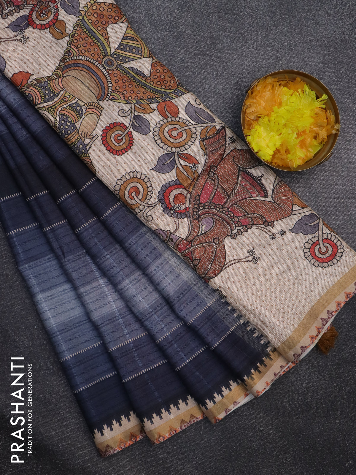 Semi tussar saree grey and beige with plain body and kalamkari printed pallu