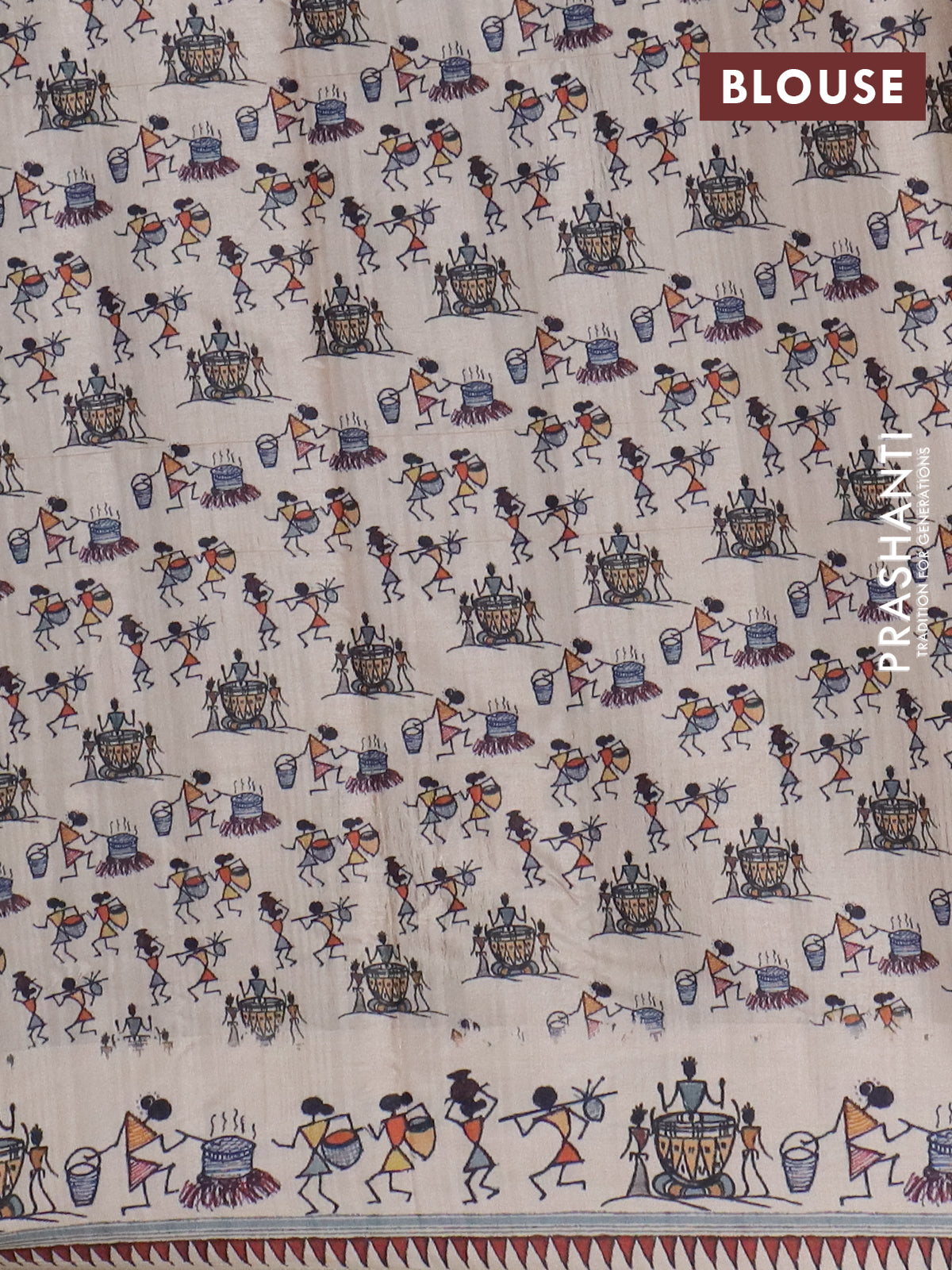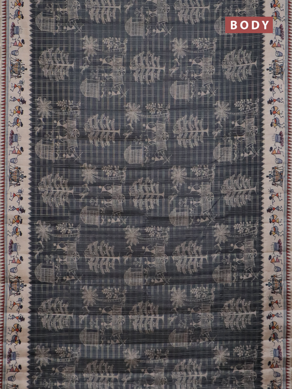Semi tussar saree grey and cream with allover zari checks & warli prints and printed border