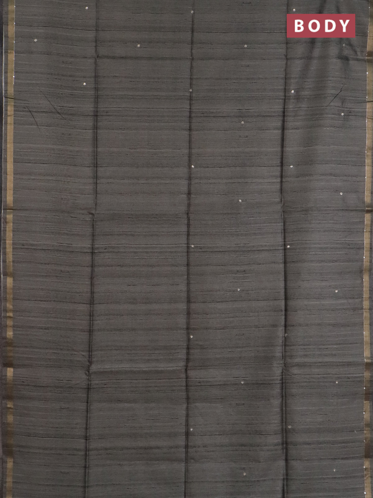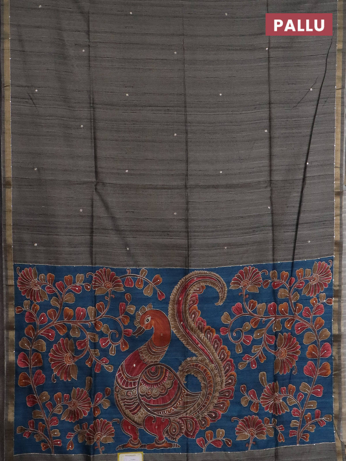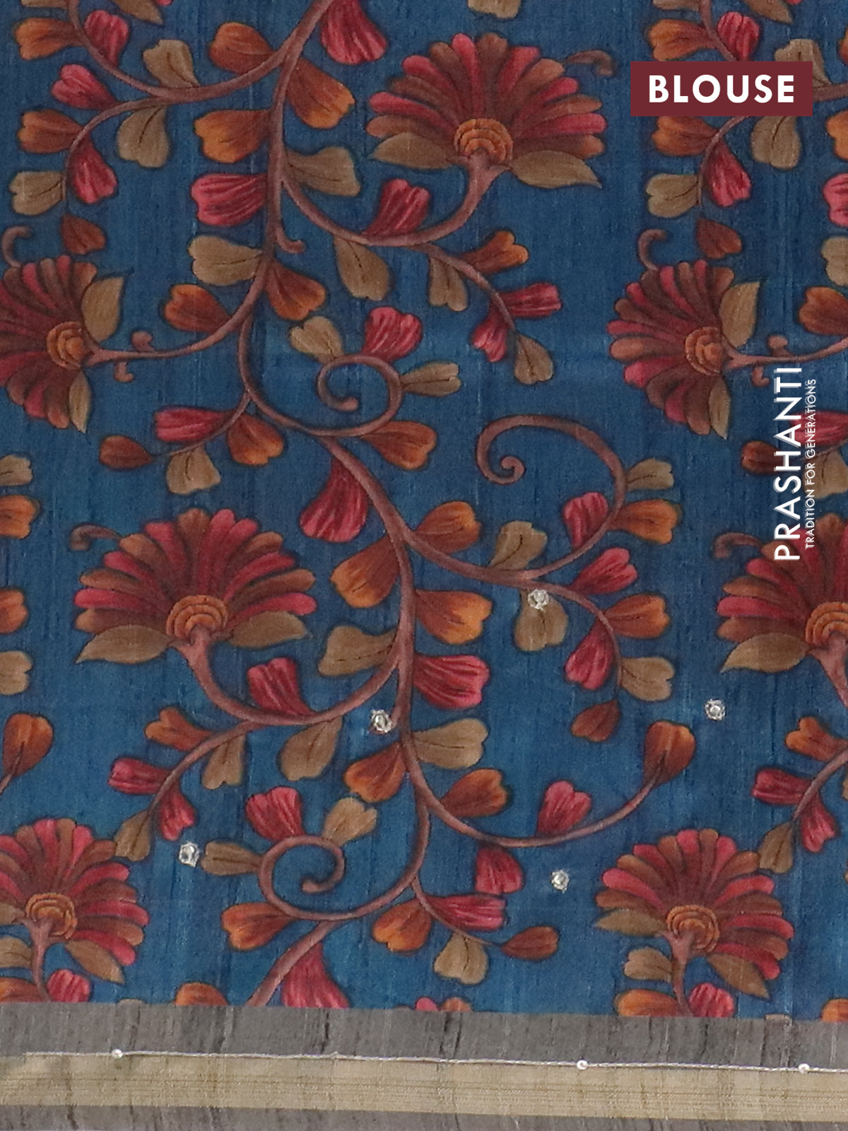 Semi tussar saree grey and peacock blue with embroidery buttas and kalamkari prints & pita work pallu