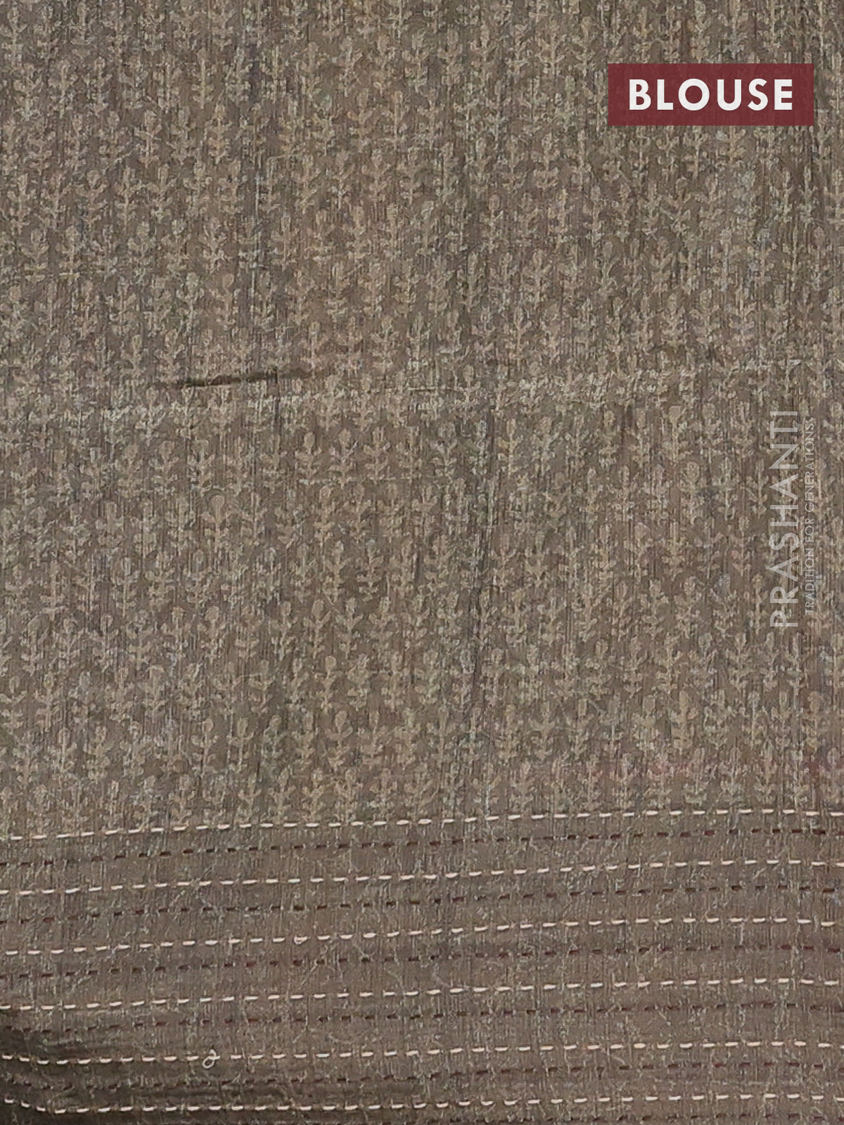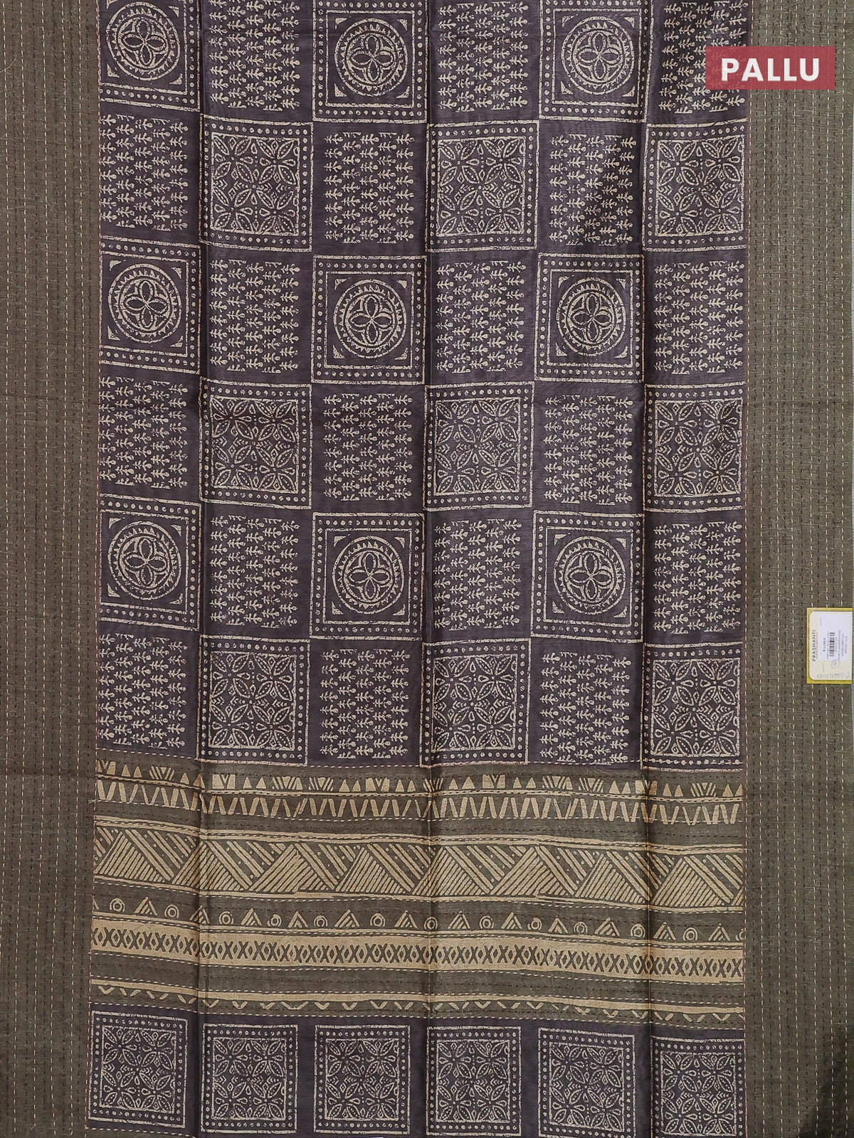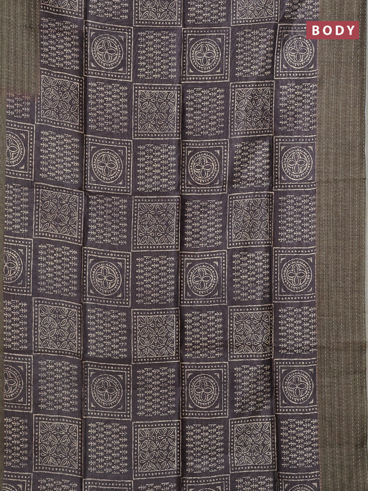 Semi tussar saree greyish brown and dark sap green with allover batik prints and katha stitch work pallu & border