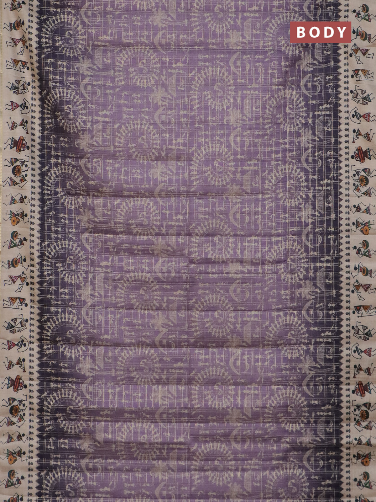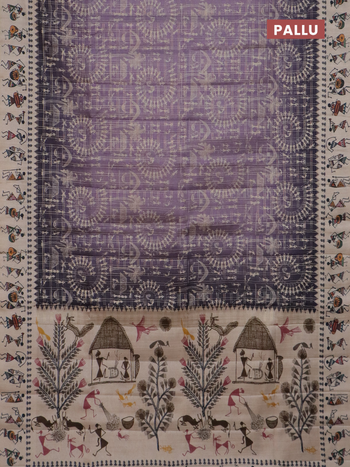 Semi tussar saree lavender shade and cream with allover zari checks & warli prints and printed border