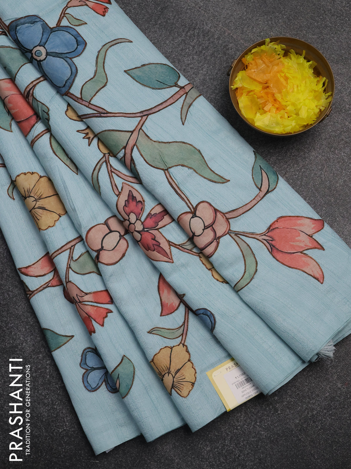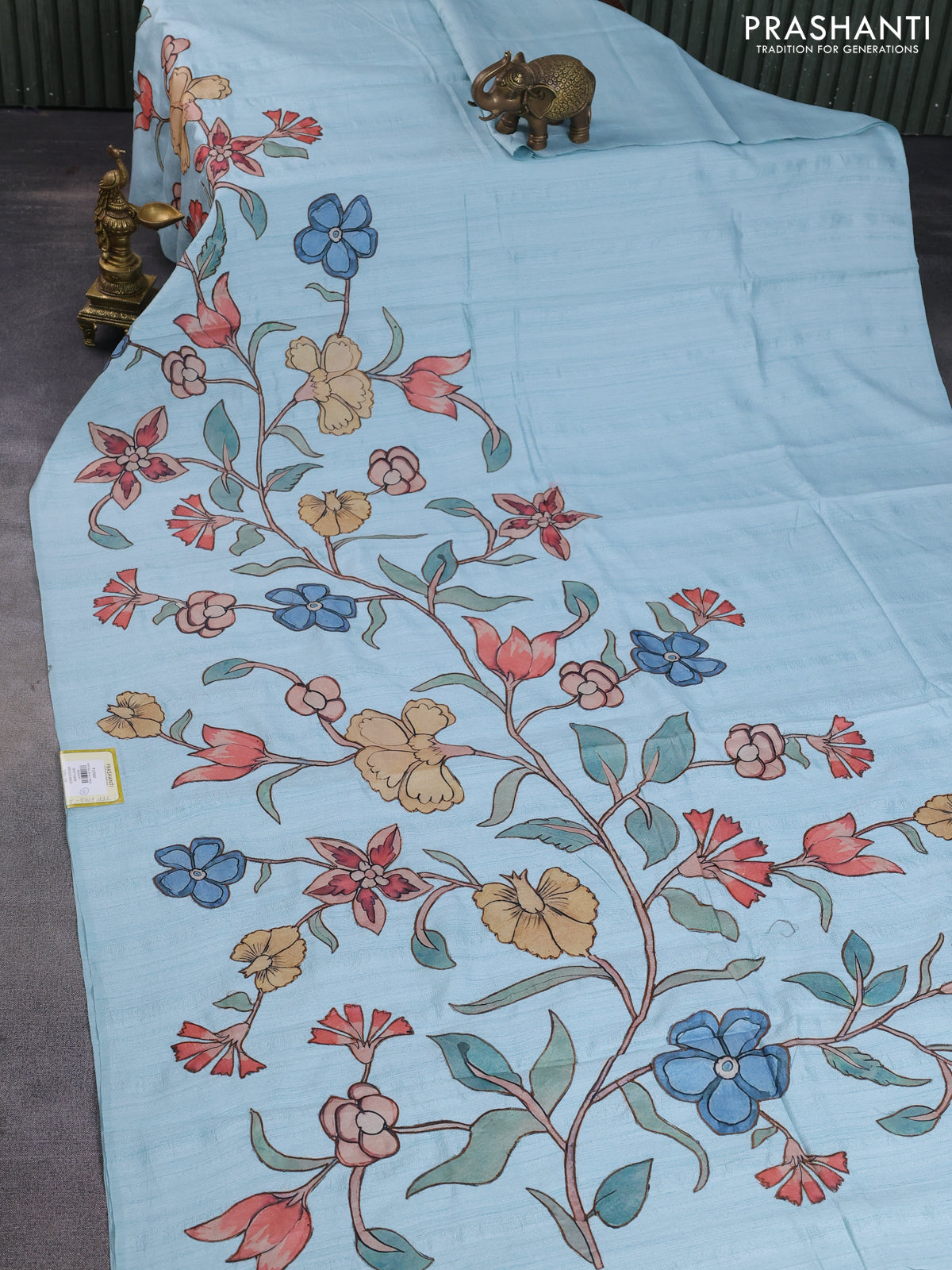 Semi tussar saree light blue with kalamkari applique work in borderless style