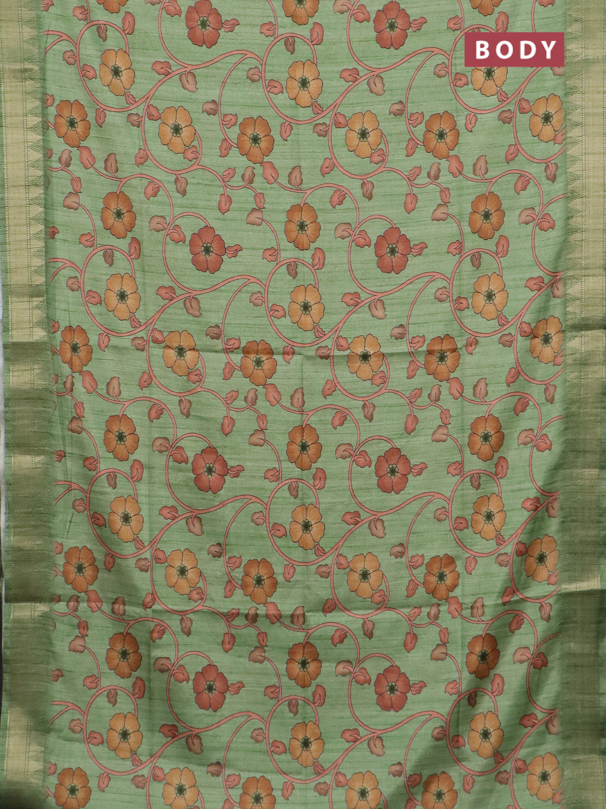 Semi tussar saree light green with allover floral prints and zari woven border
