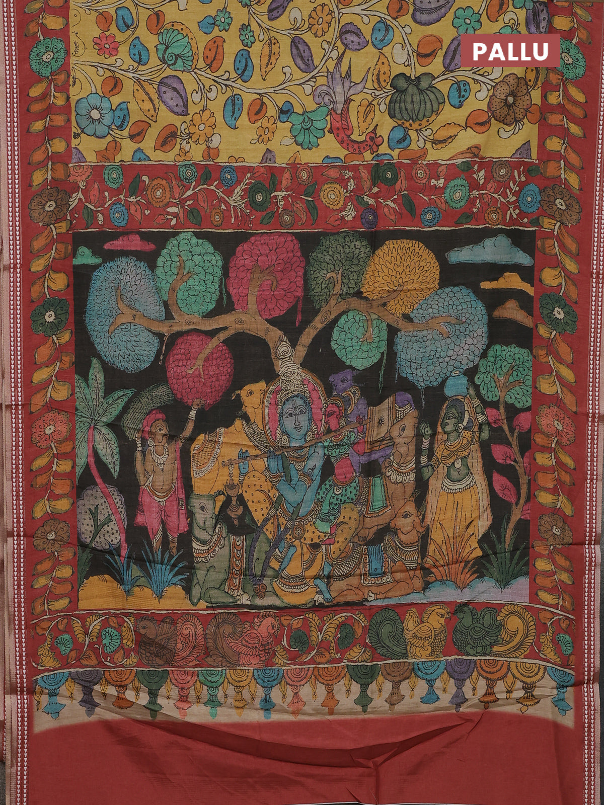 Semi tussar saree mustard yellow and maroon with allover kalamkari prints and printed border