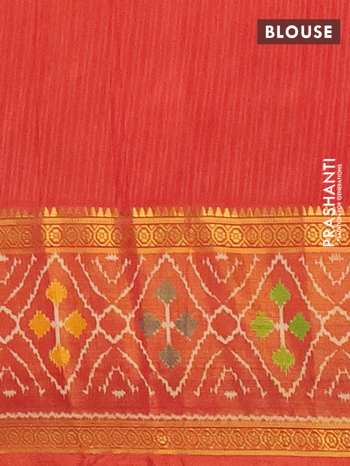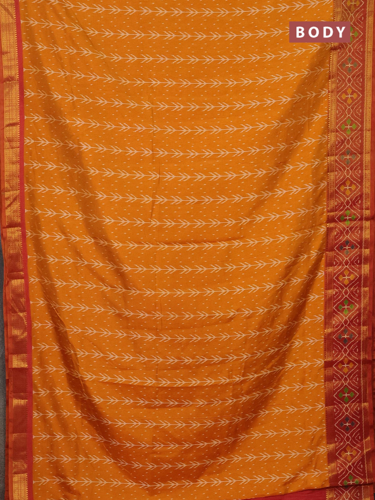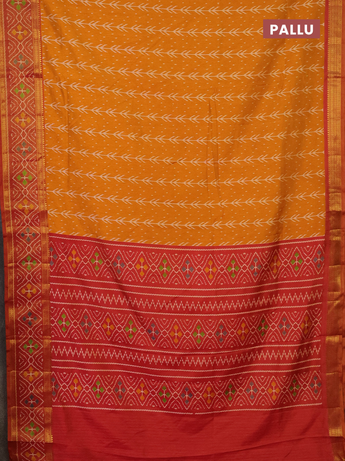 Semi tussar saree mustard yellow and rust shade with allover ikat prints and zari woven ikat border