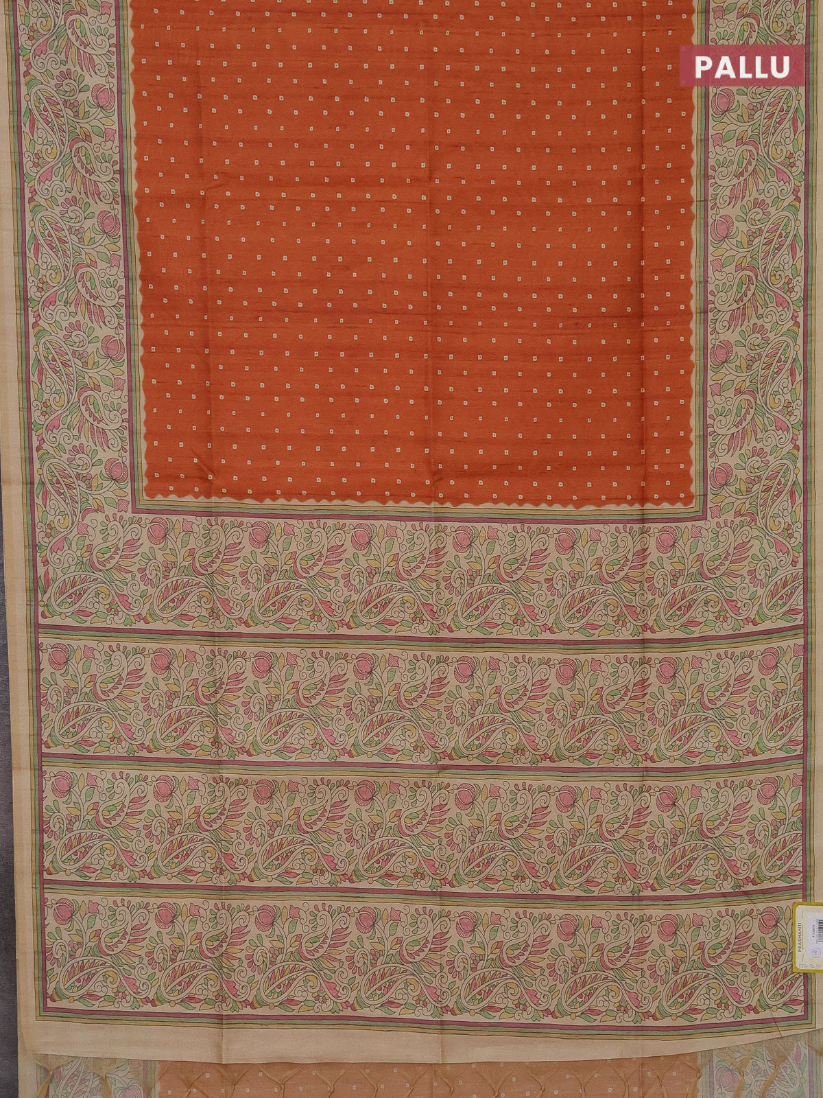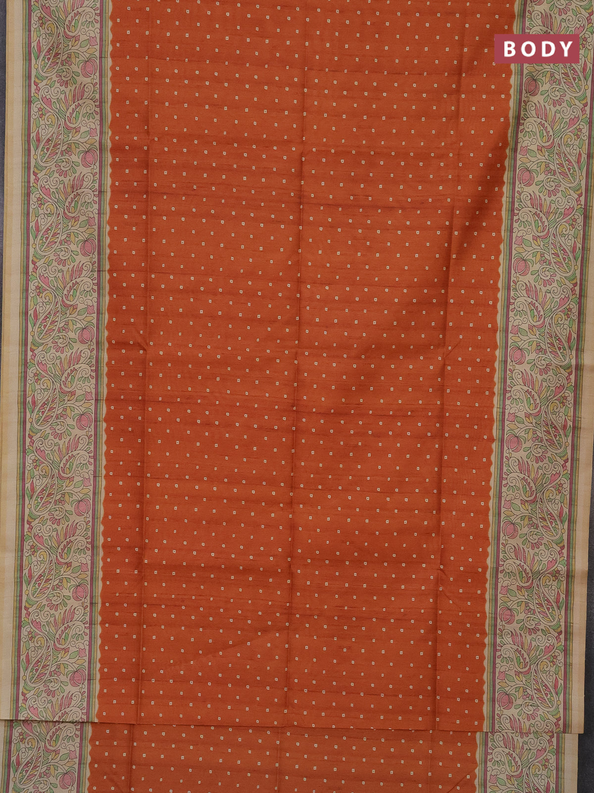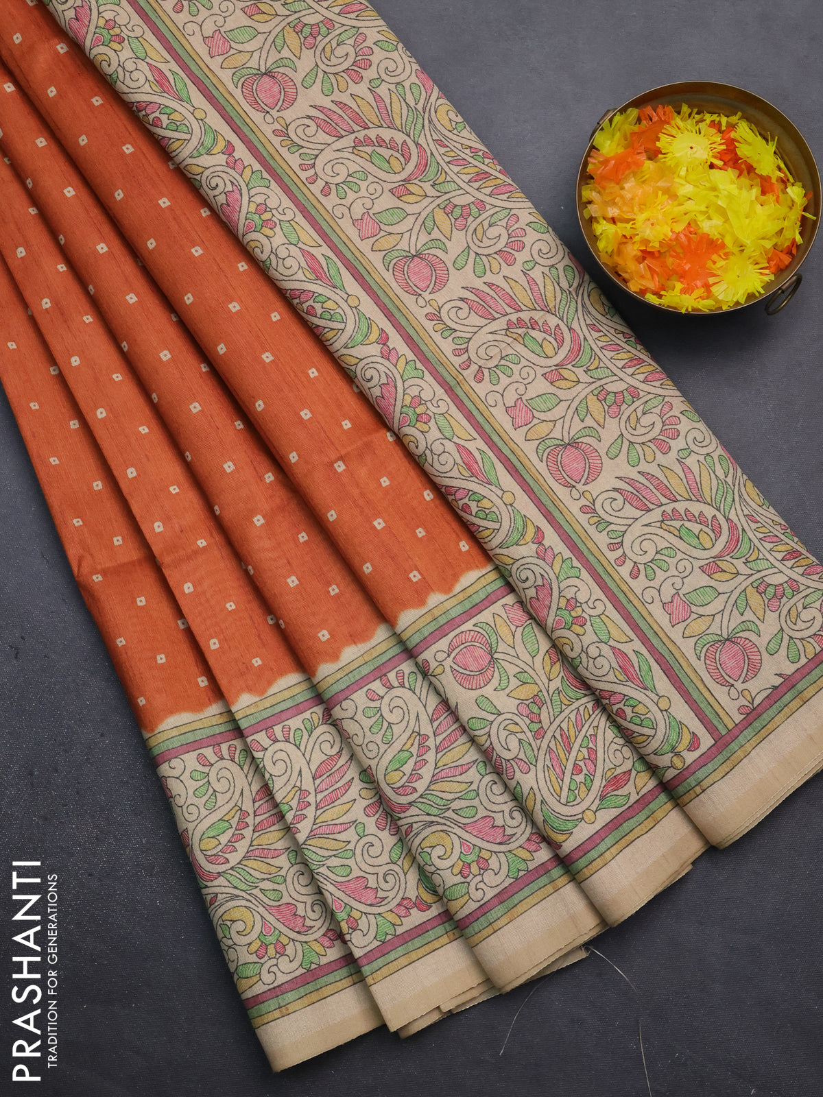 Semi tussar saree orange and sandal with bandhini butta prints and printed border