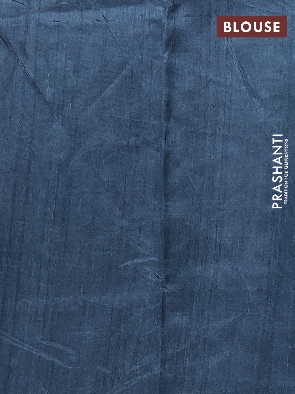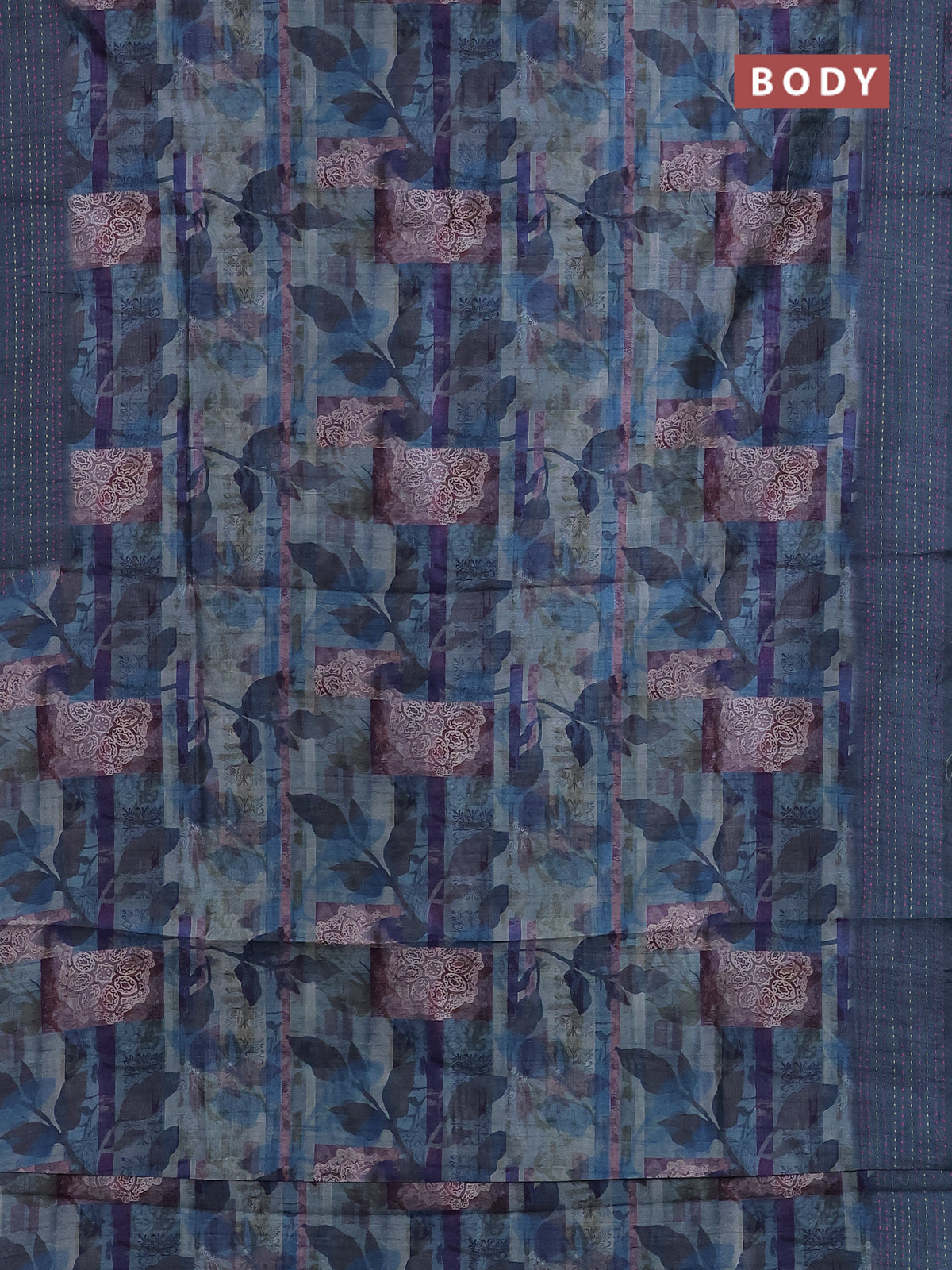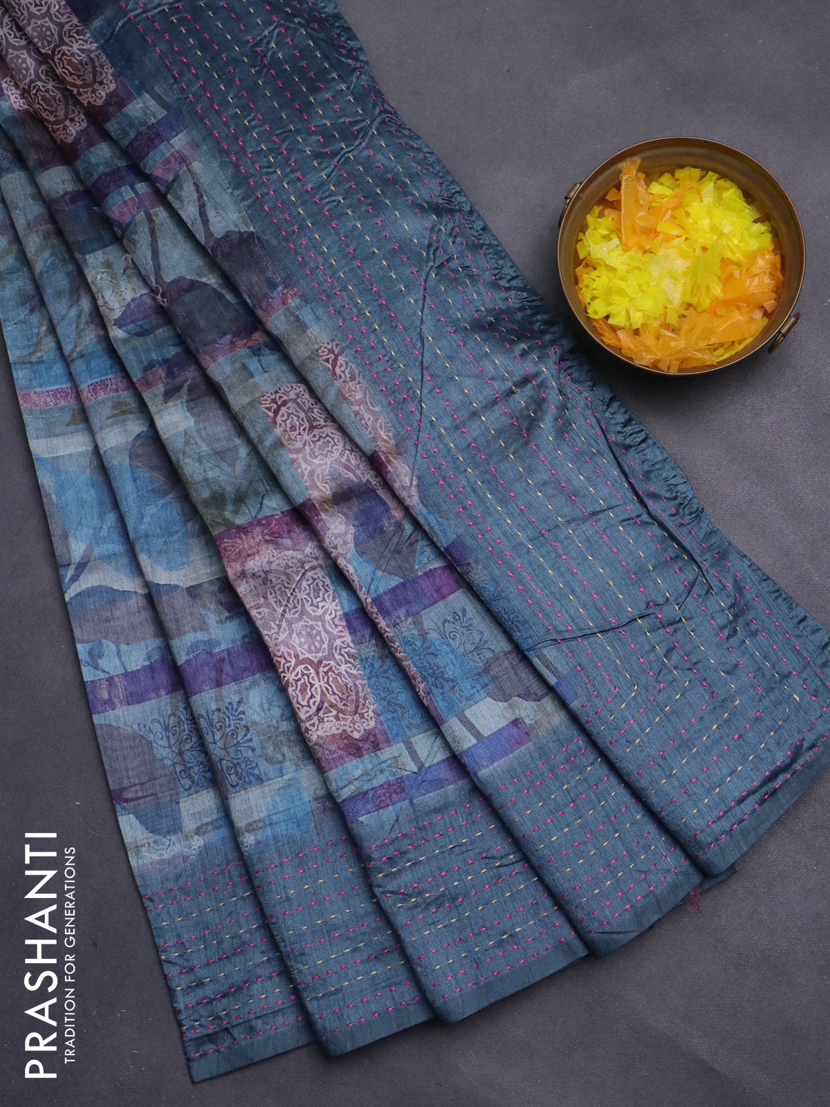Semi tussar saree pastel blue and peacock blue with allover prints and kantha stitch work border
