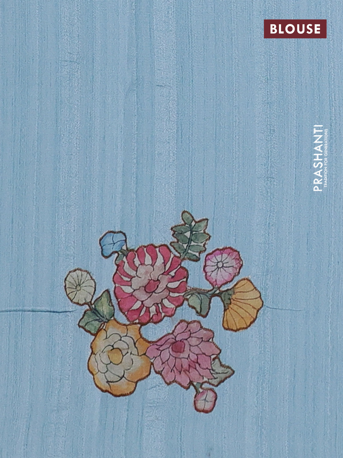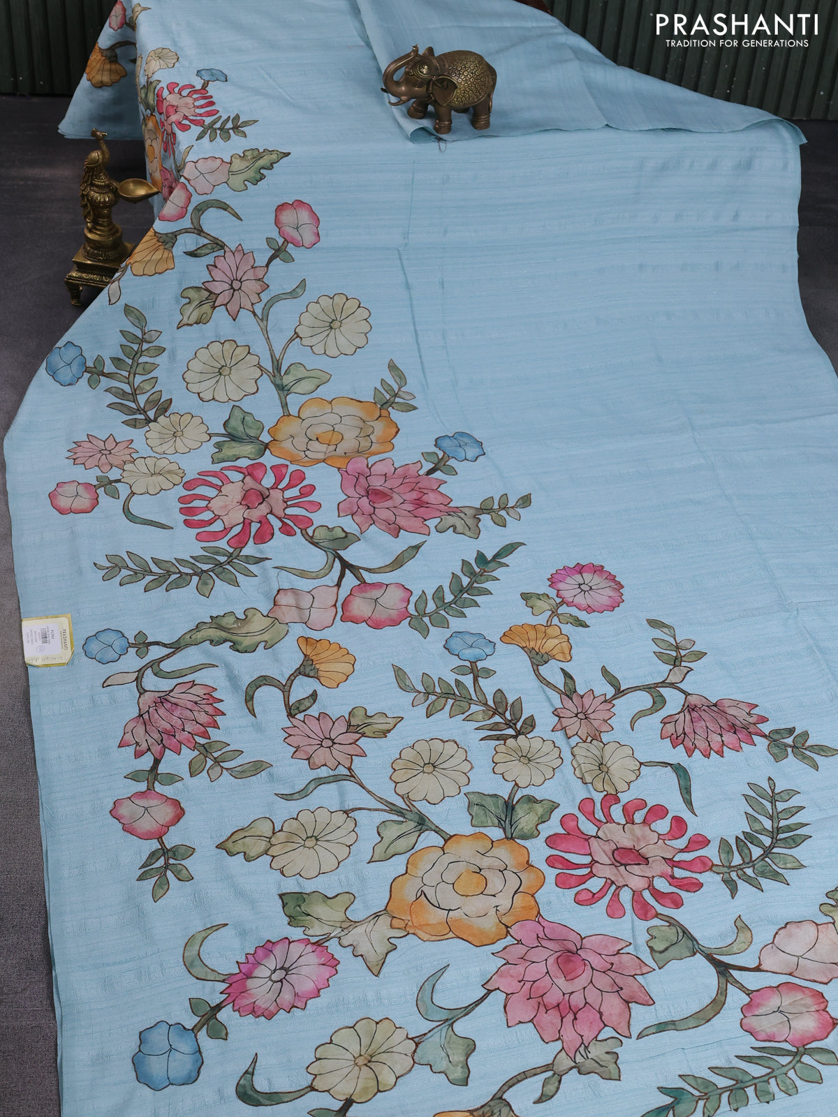 Semi tussar saree pastel blue with kalamkari applique work in borderless style