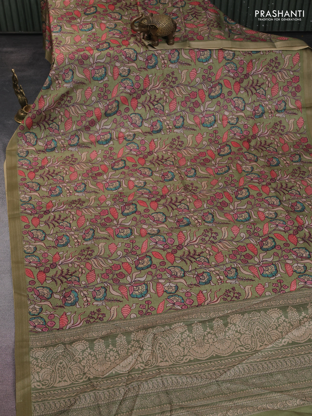 Semi tussar saree pastel green with allover kalamkari prints and zari woven border