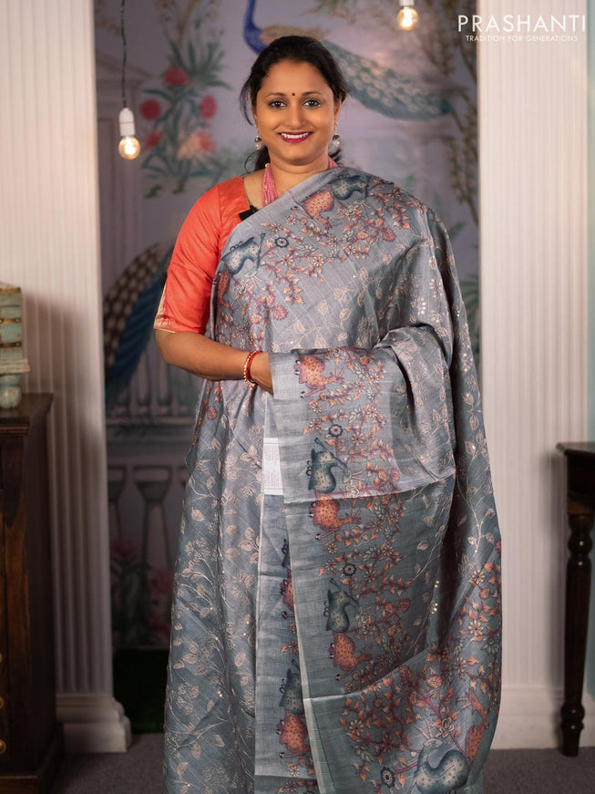 Semi tussar saree pastel grey with allover leaf & floral embroidery sequin work and digital printed border