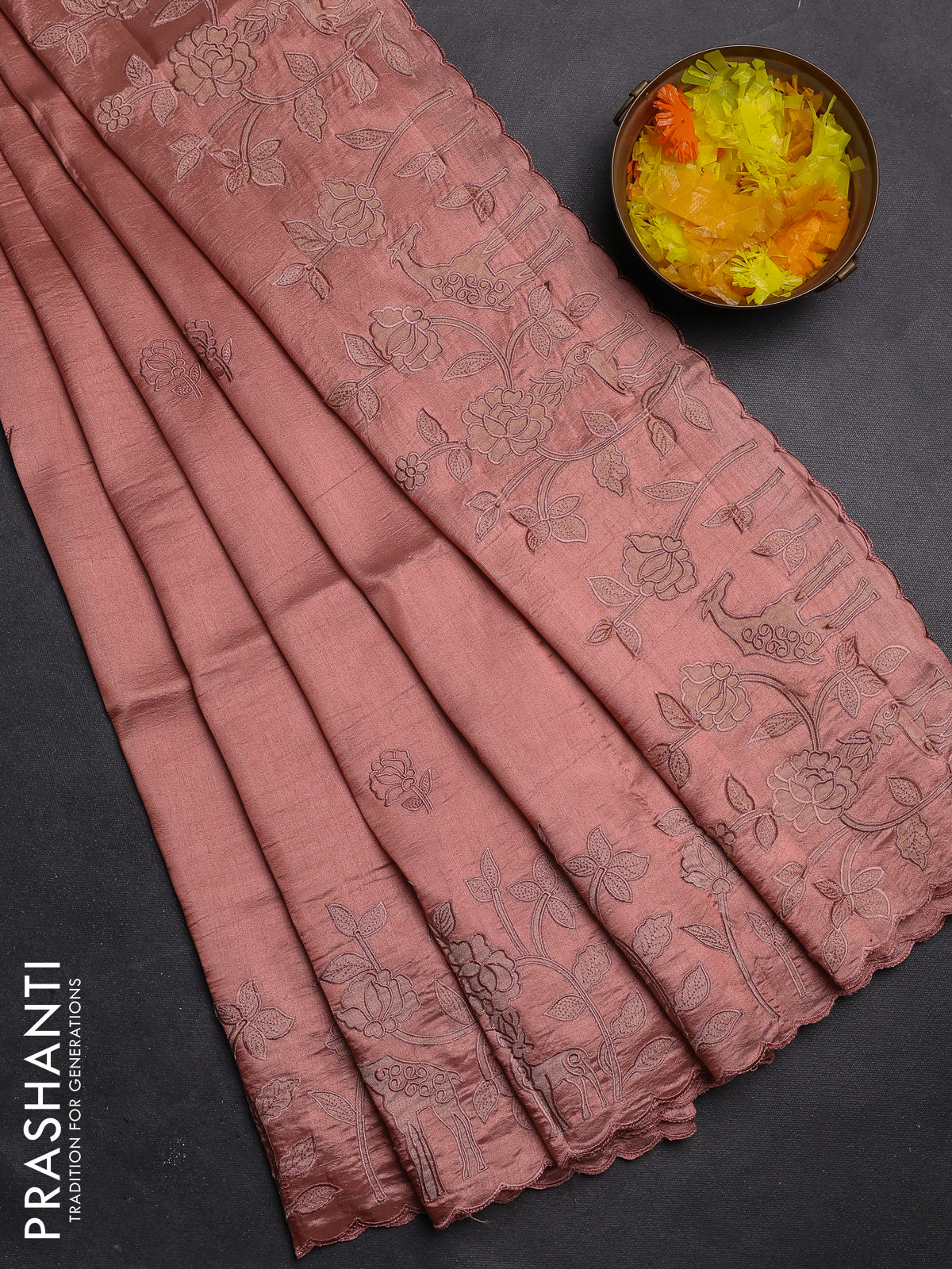 Semi tussar saree pastel peach with floral embroidery work and applique work border