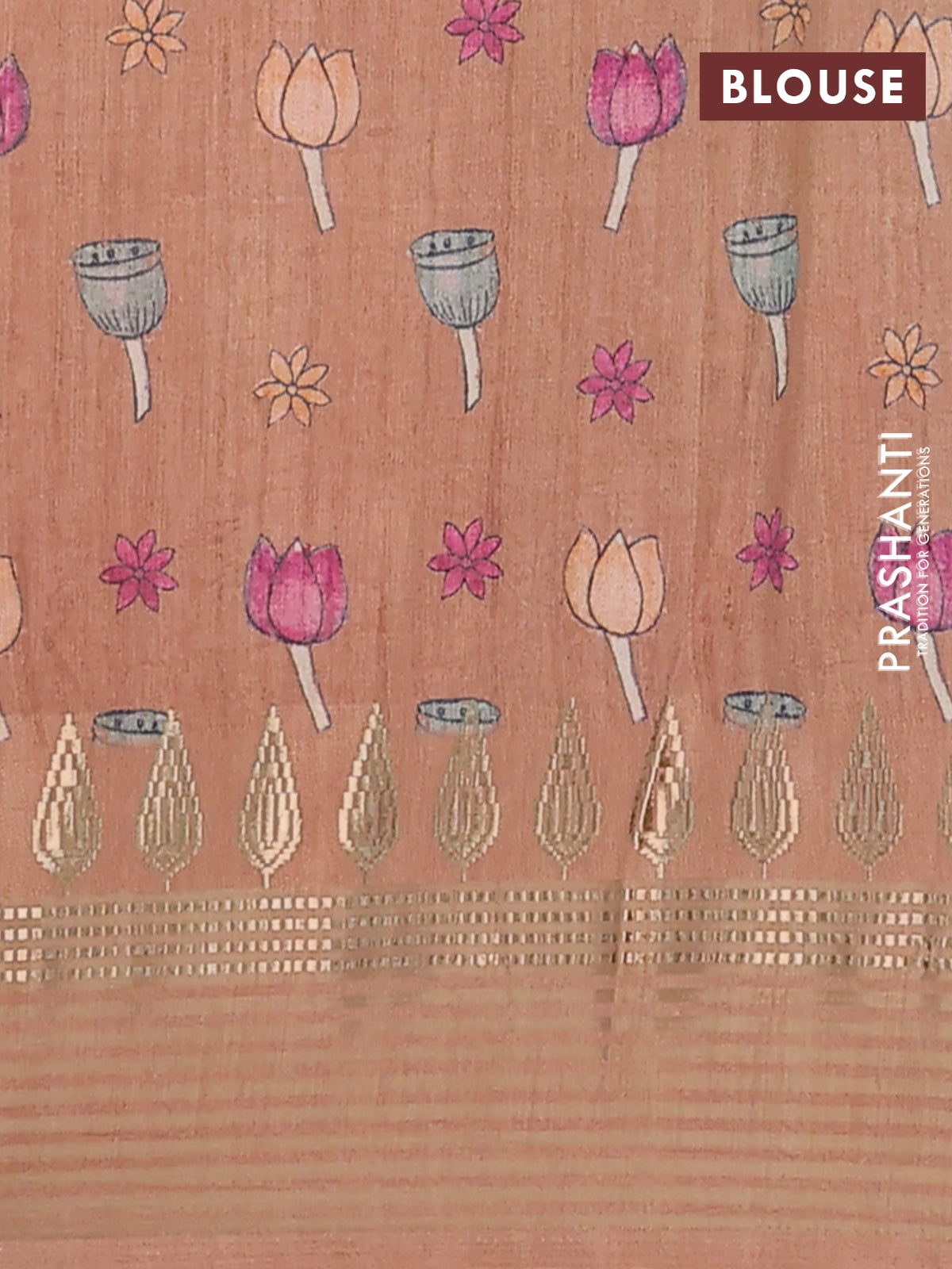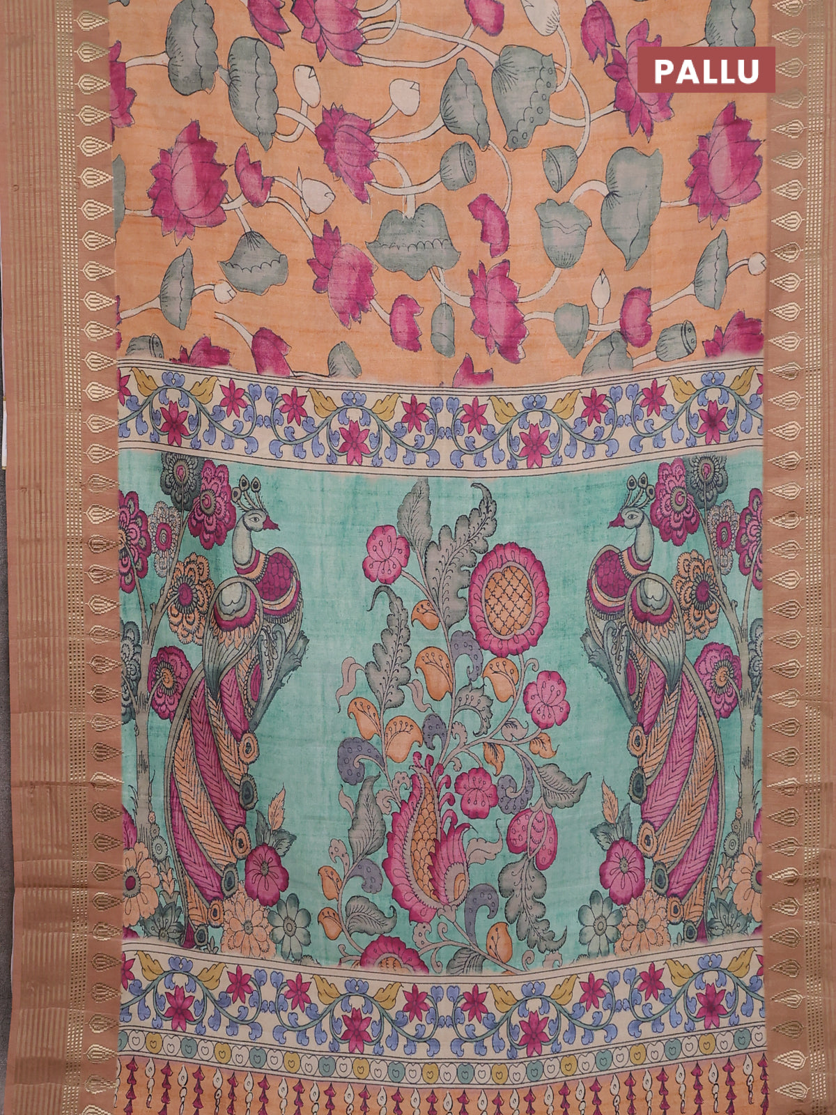 Semi tussar saree peach orange and pastel brown with allover kalamkari prints and zari woven border