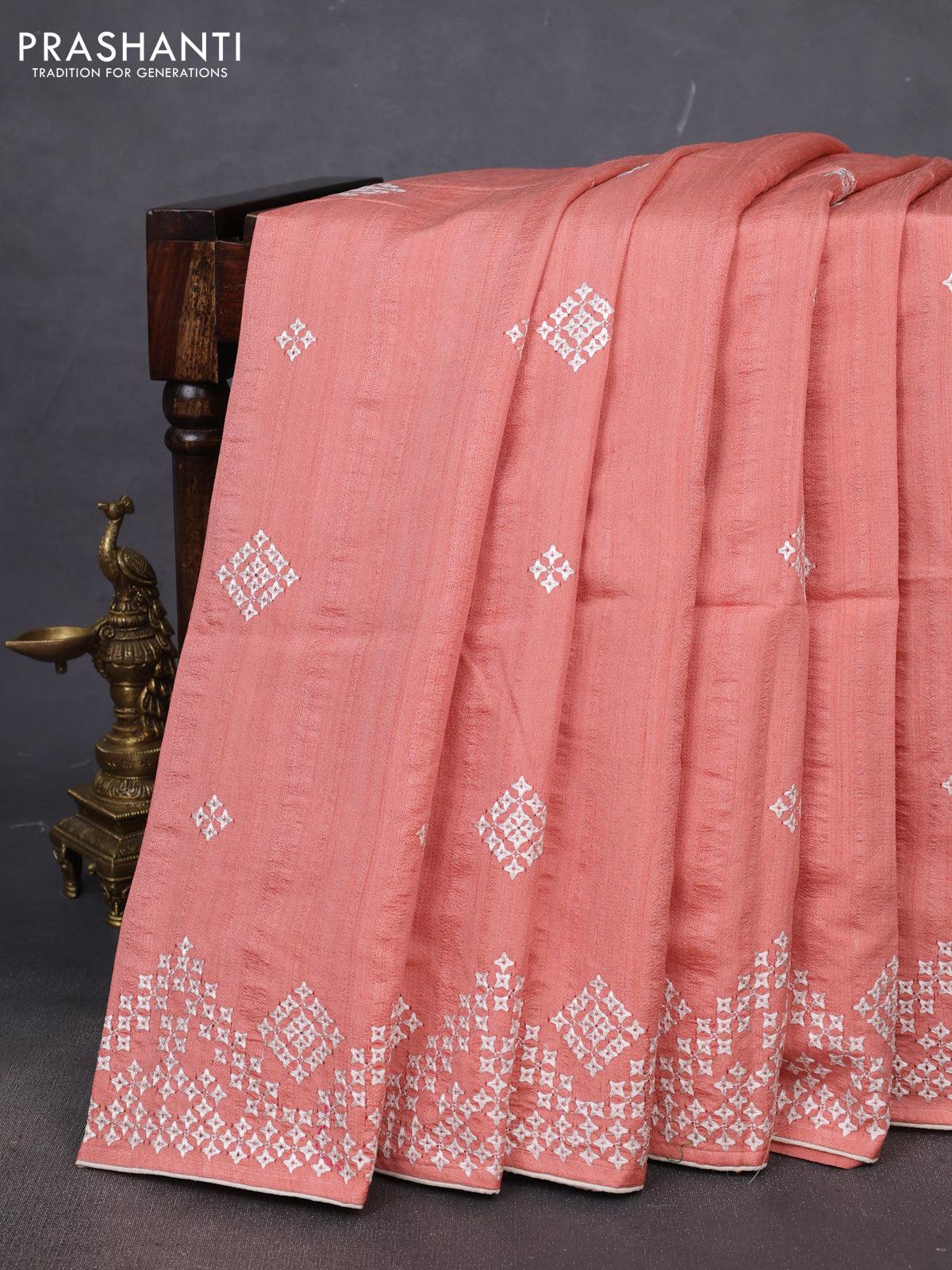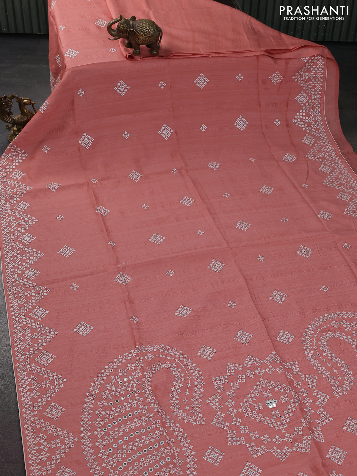 Semi tussar saree peach shade and cream with embroidery work buttas and embroidery mirror work border