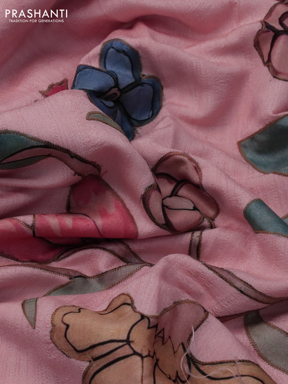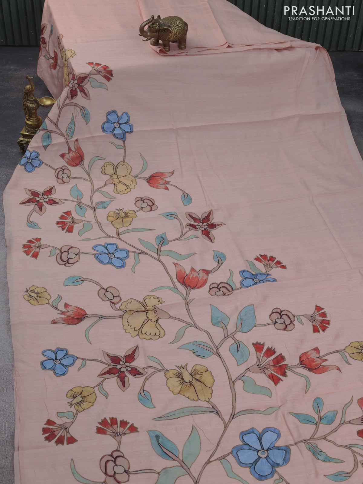 Semi tussar saree peach shade with allover kalamkari applique work in borderless style