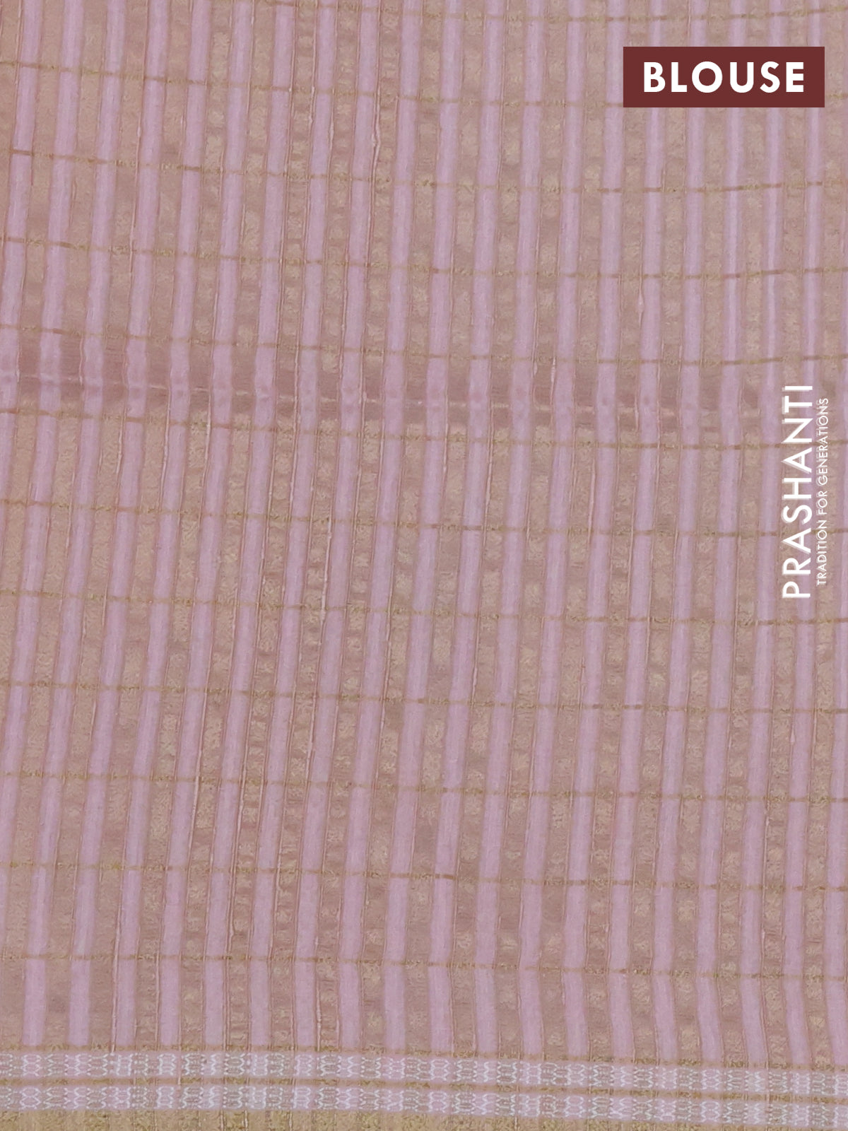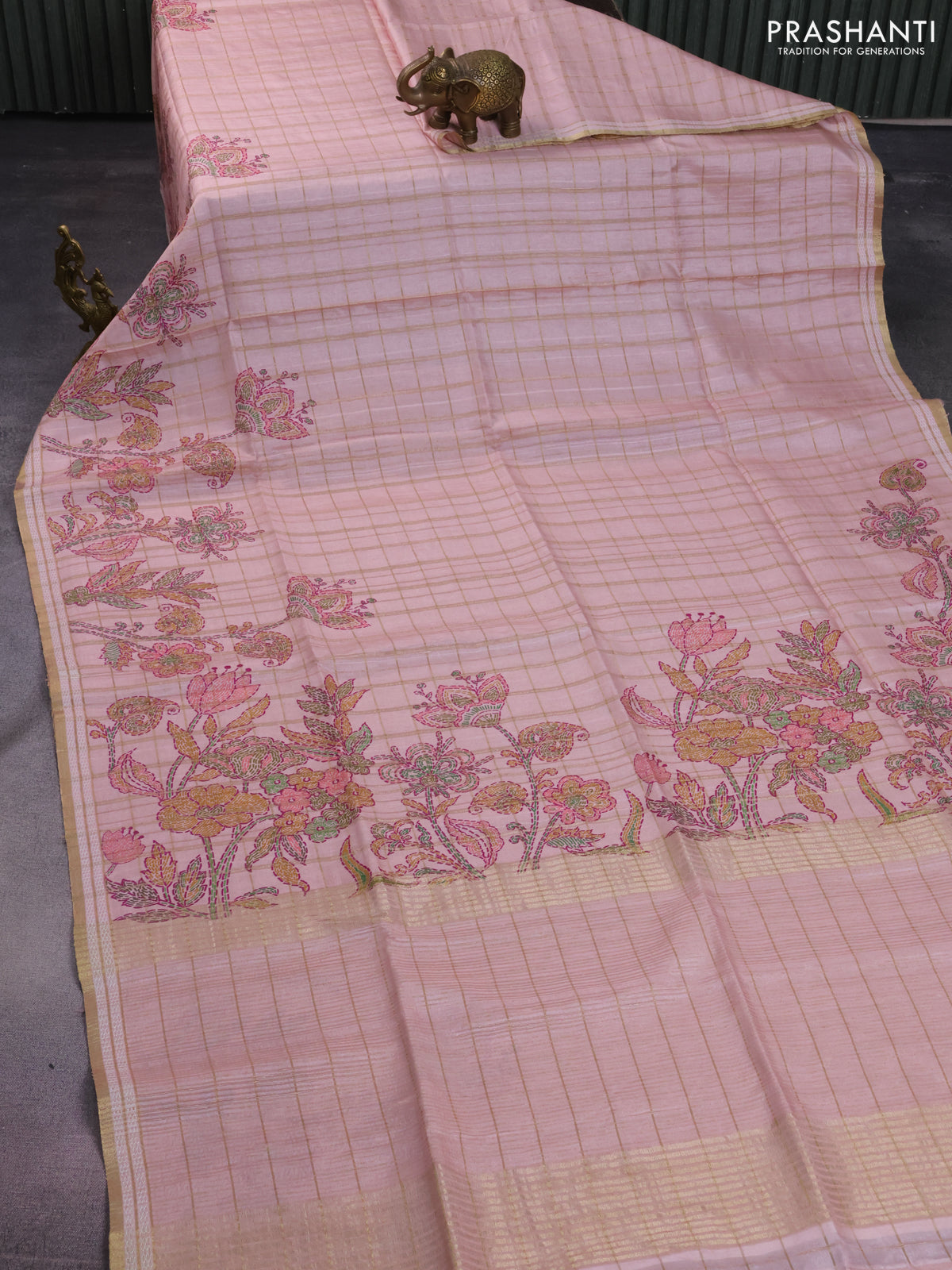 Semi tussar saree peach shade with allover zari checks & digital prints and zari woven border