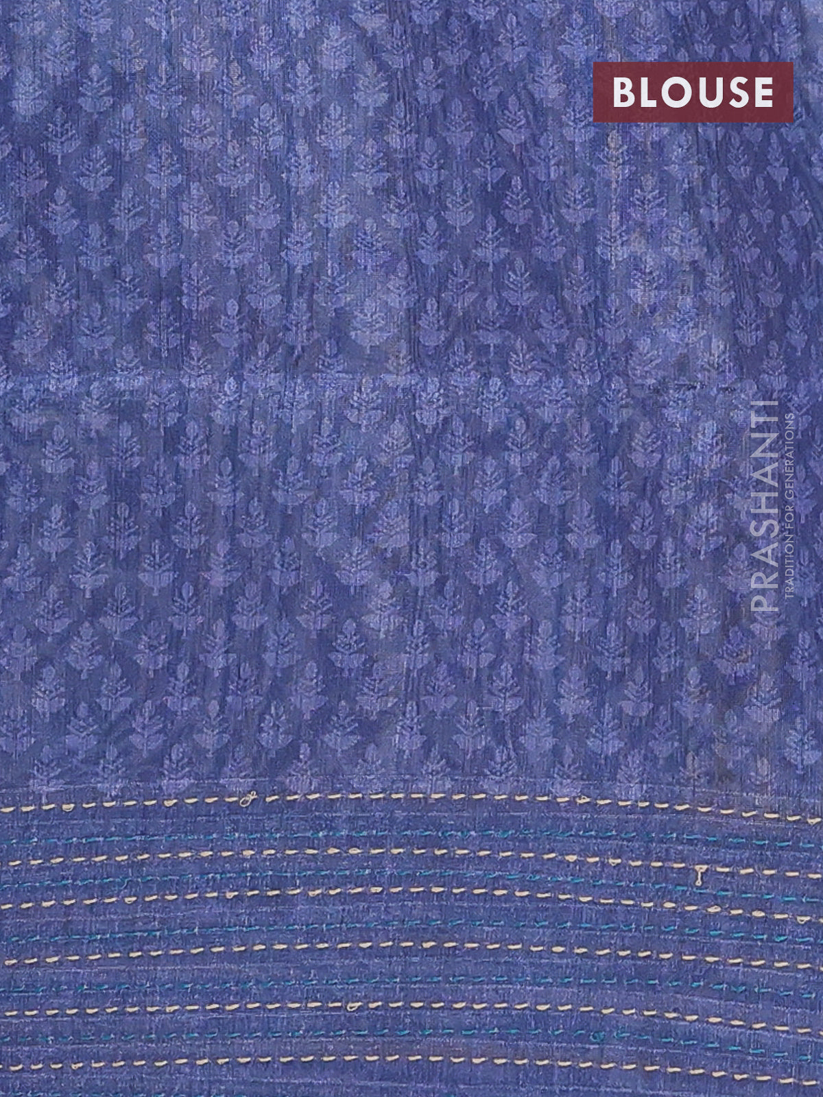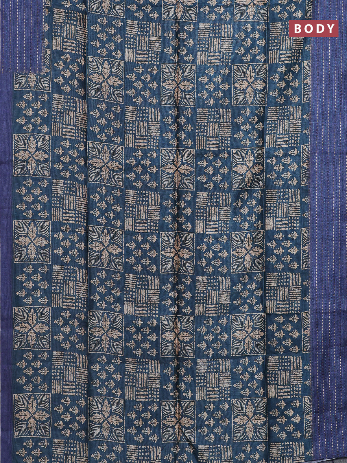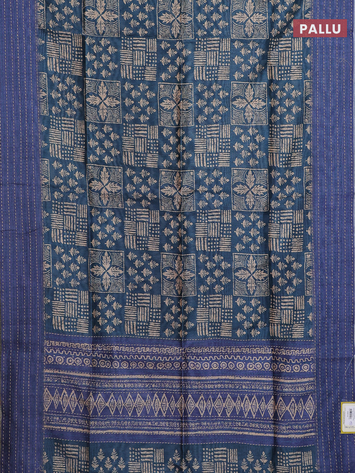 Semi tussar saree peacock blue and blue with allover batik prints and katha stitch work pallu & border
