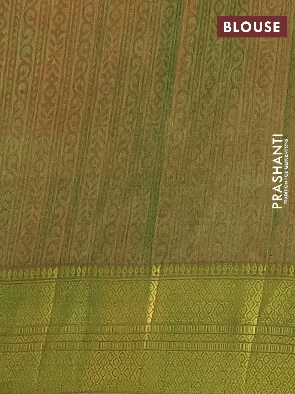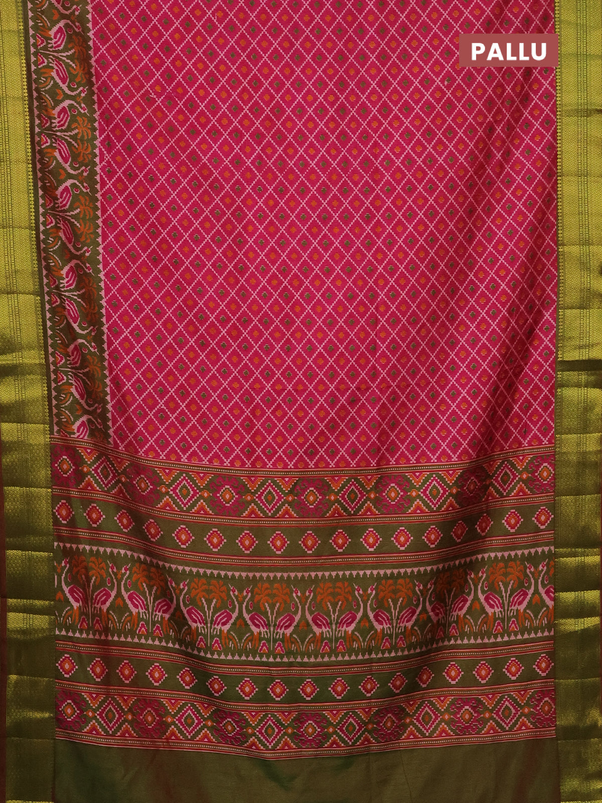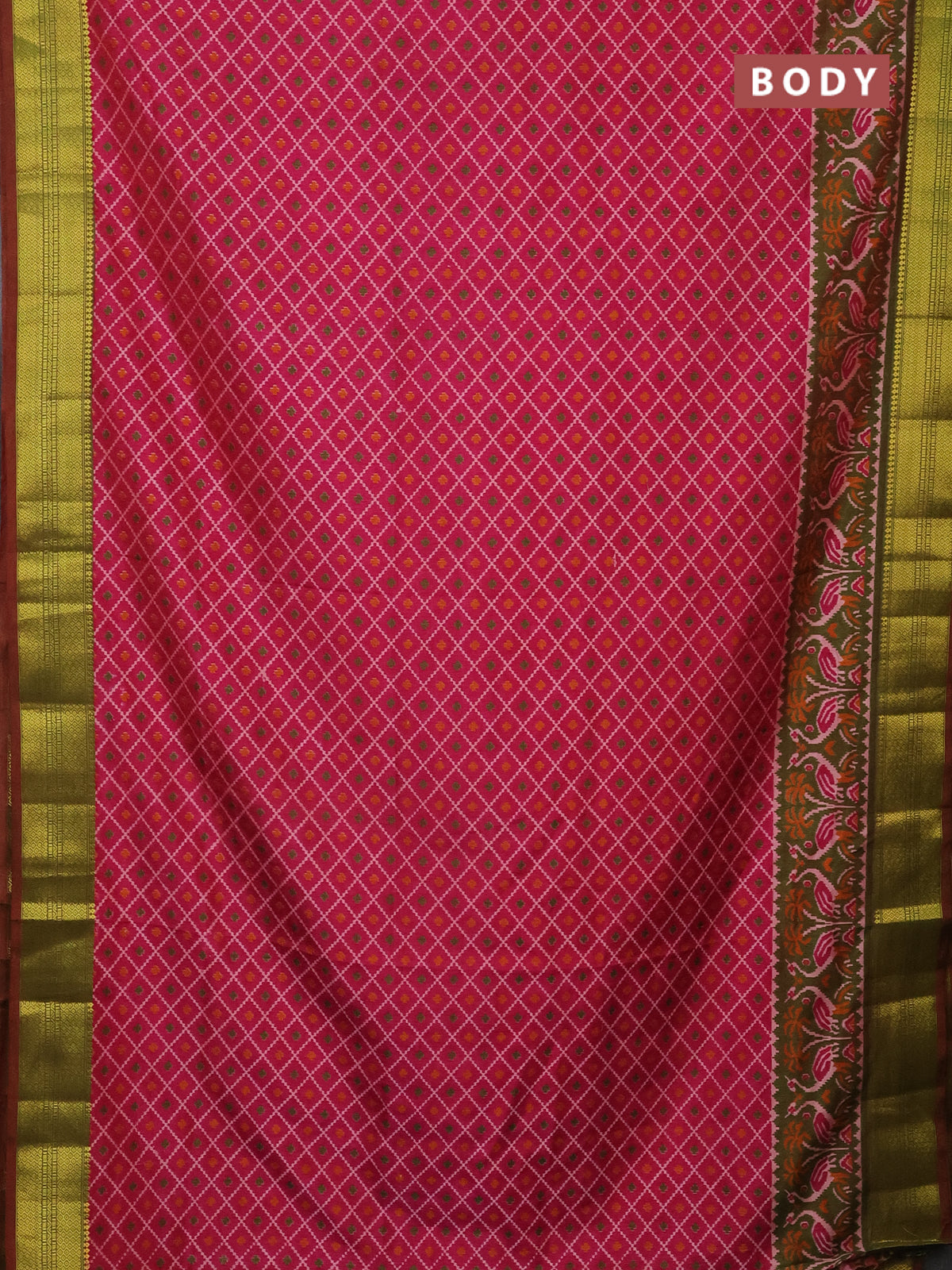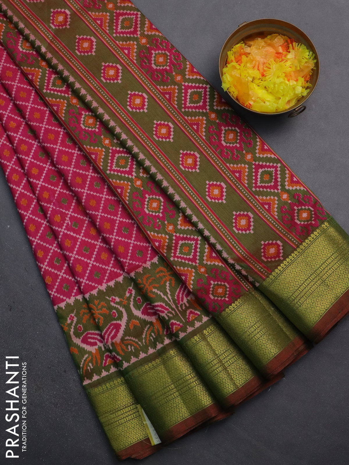 Semi tussar saree pink and dual shade of green with allover ikat prints and zari woven border