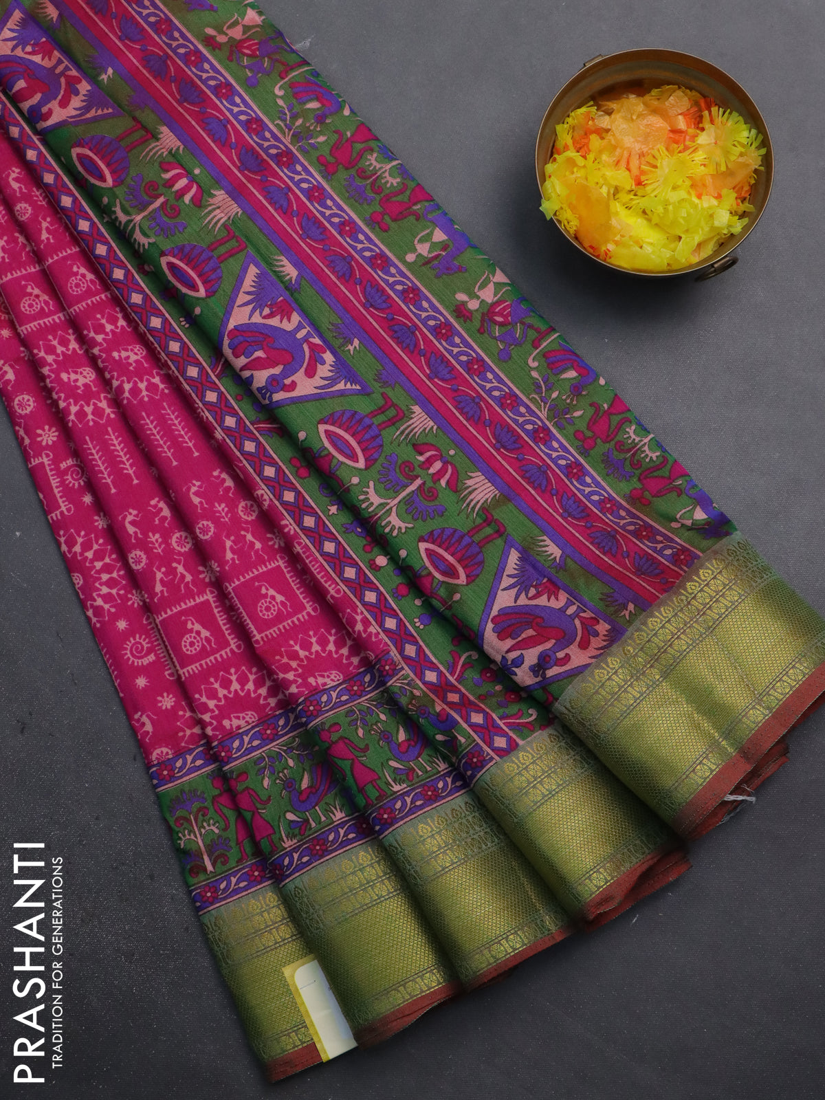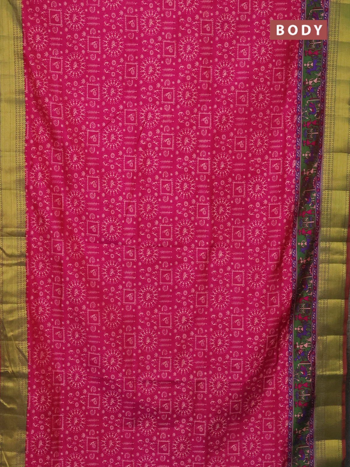 Semi tussar saree pink and dual shade of green with allover warli prints and zari woven border