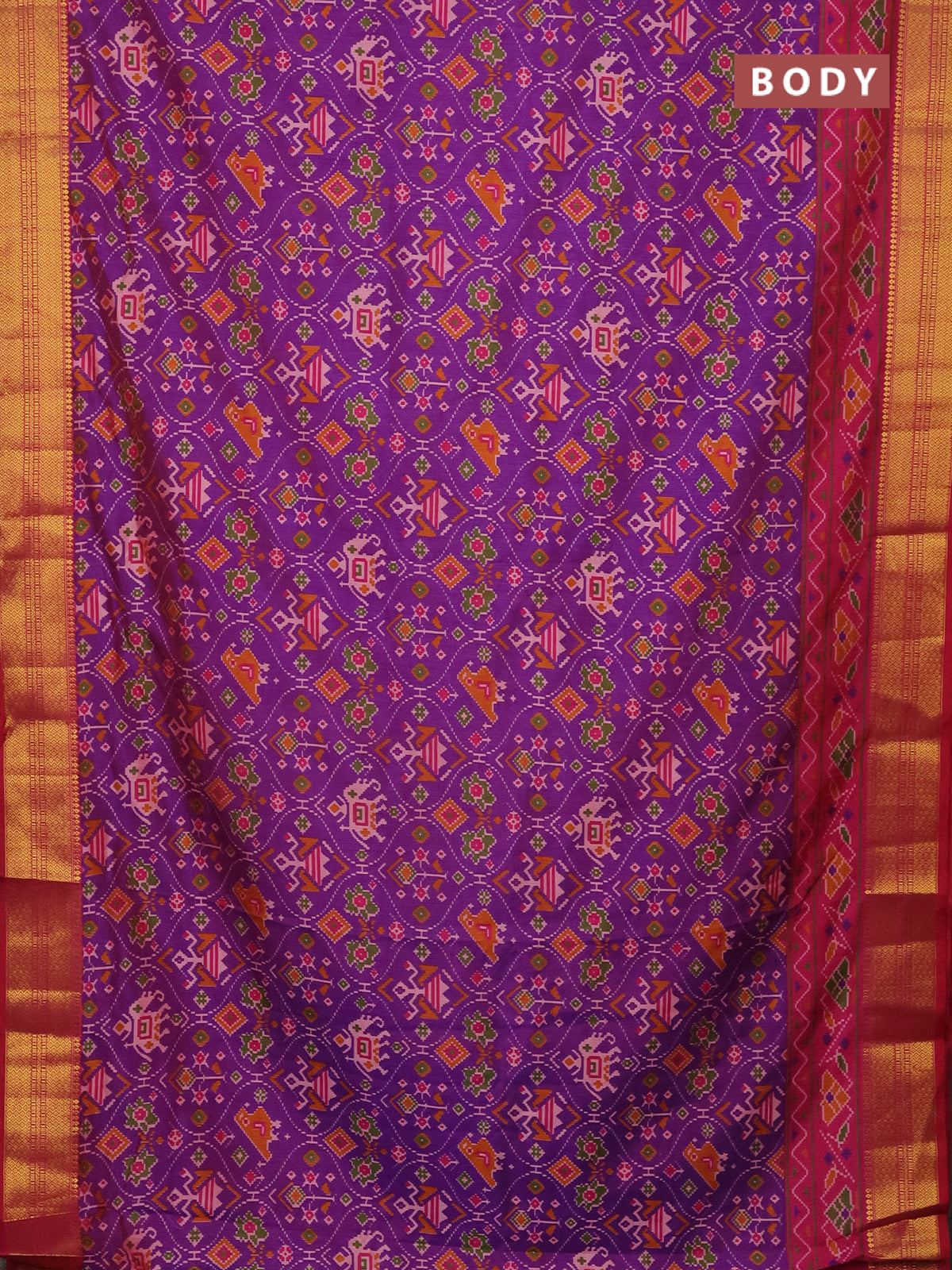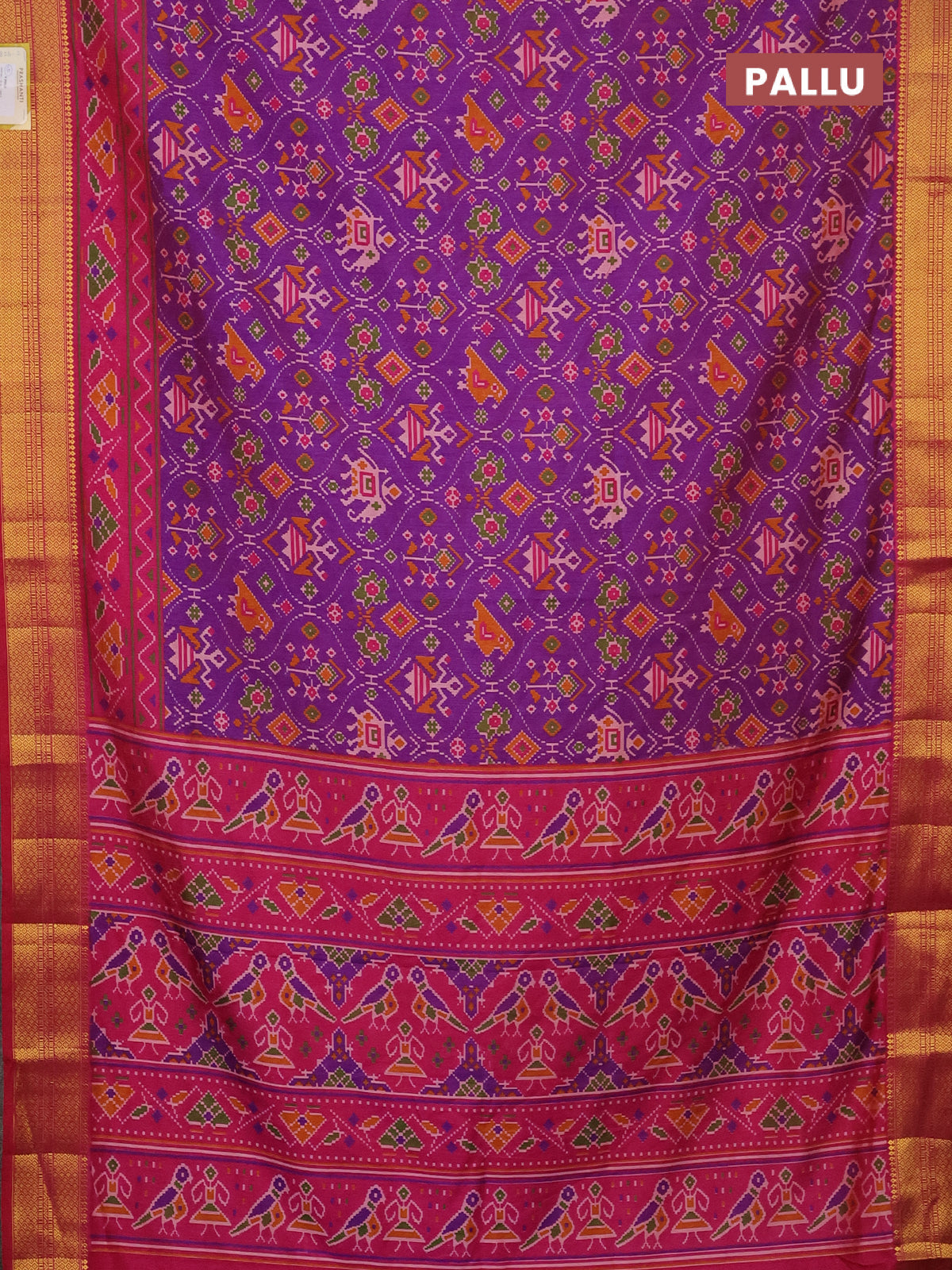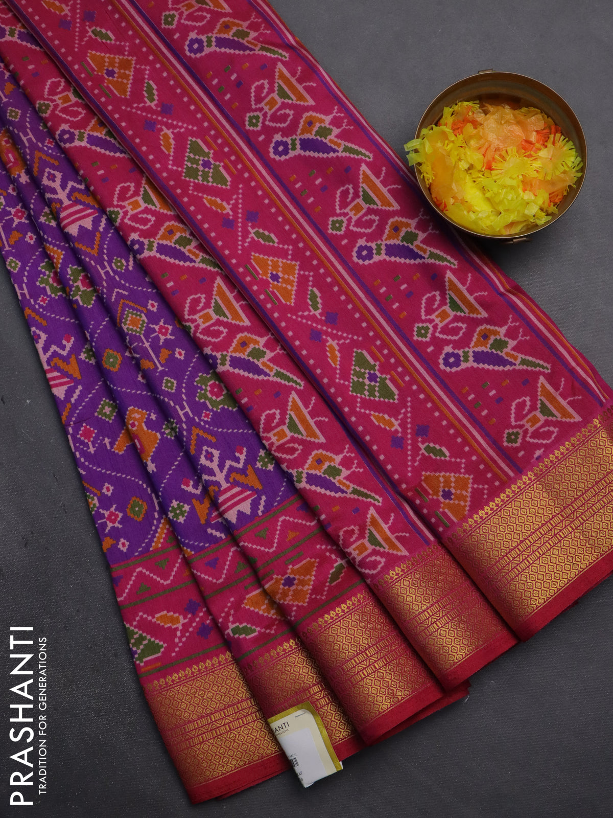 Semi tussar saree purple and pink with allover patola prints and zari woven border