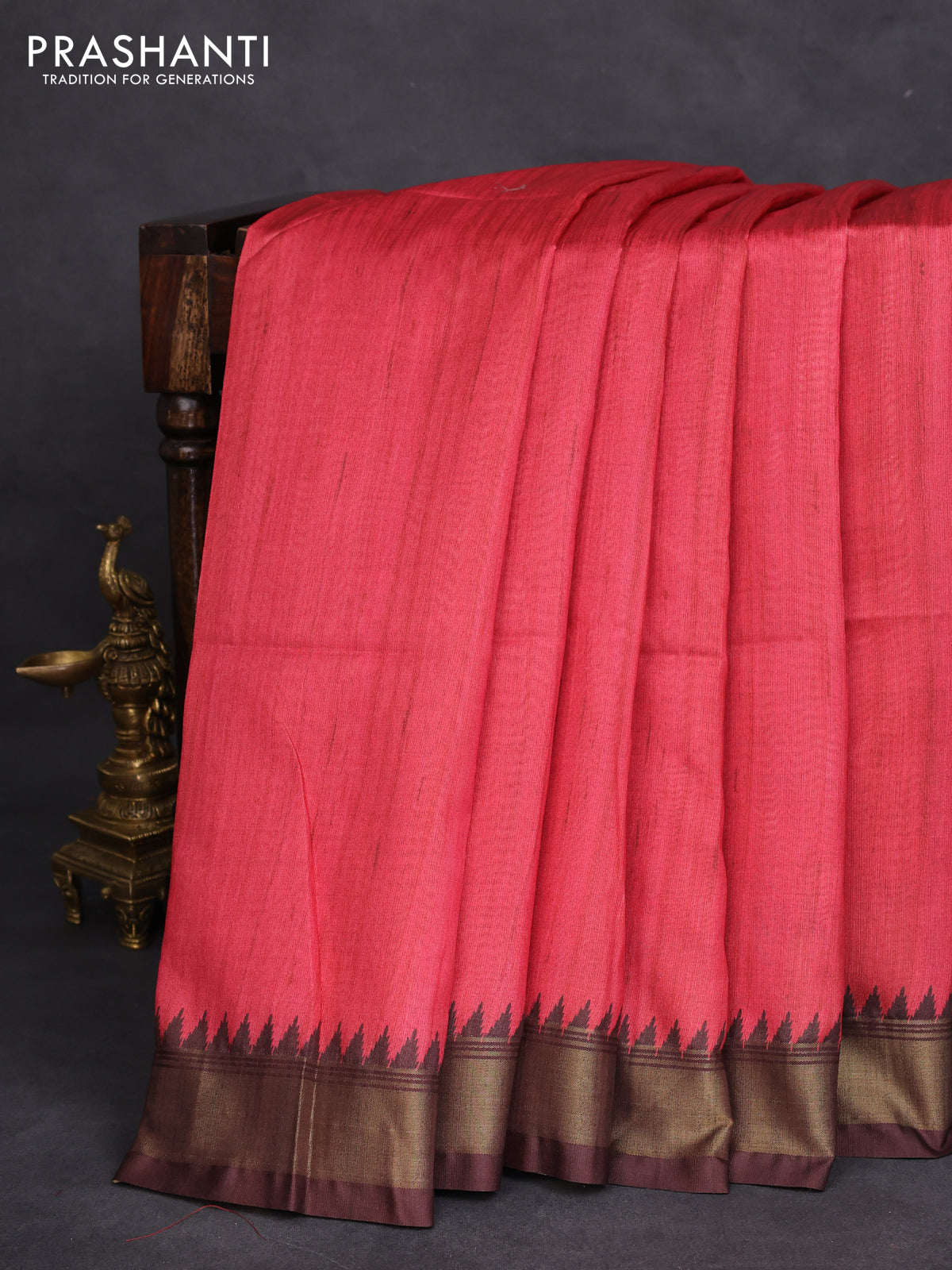 Semi tussar saree red and beige with plain body and madhubani printed pallu
