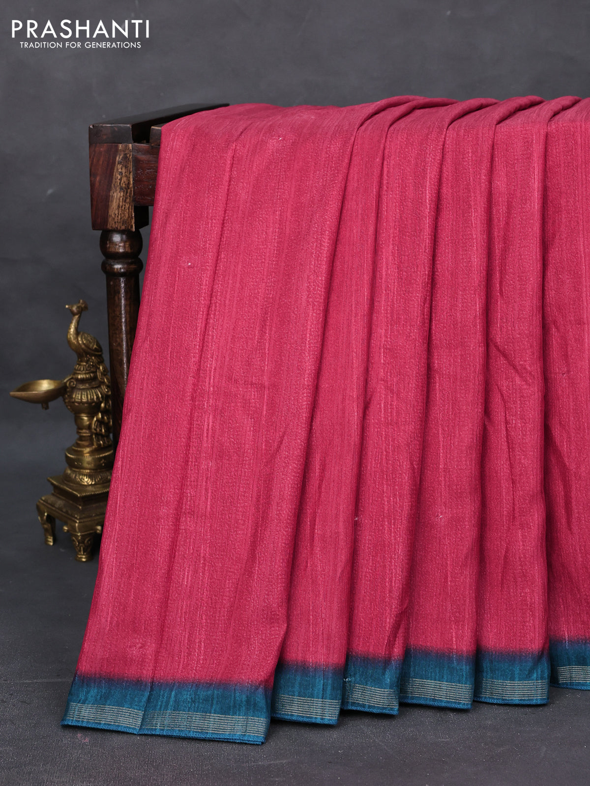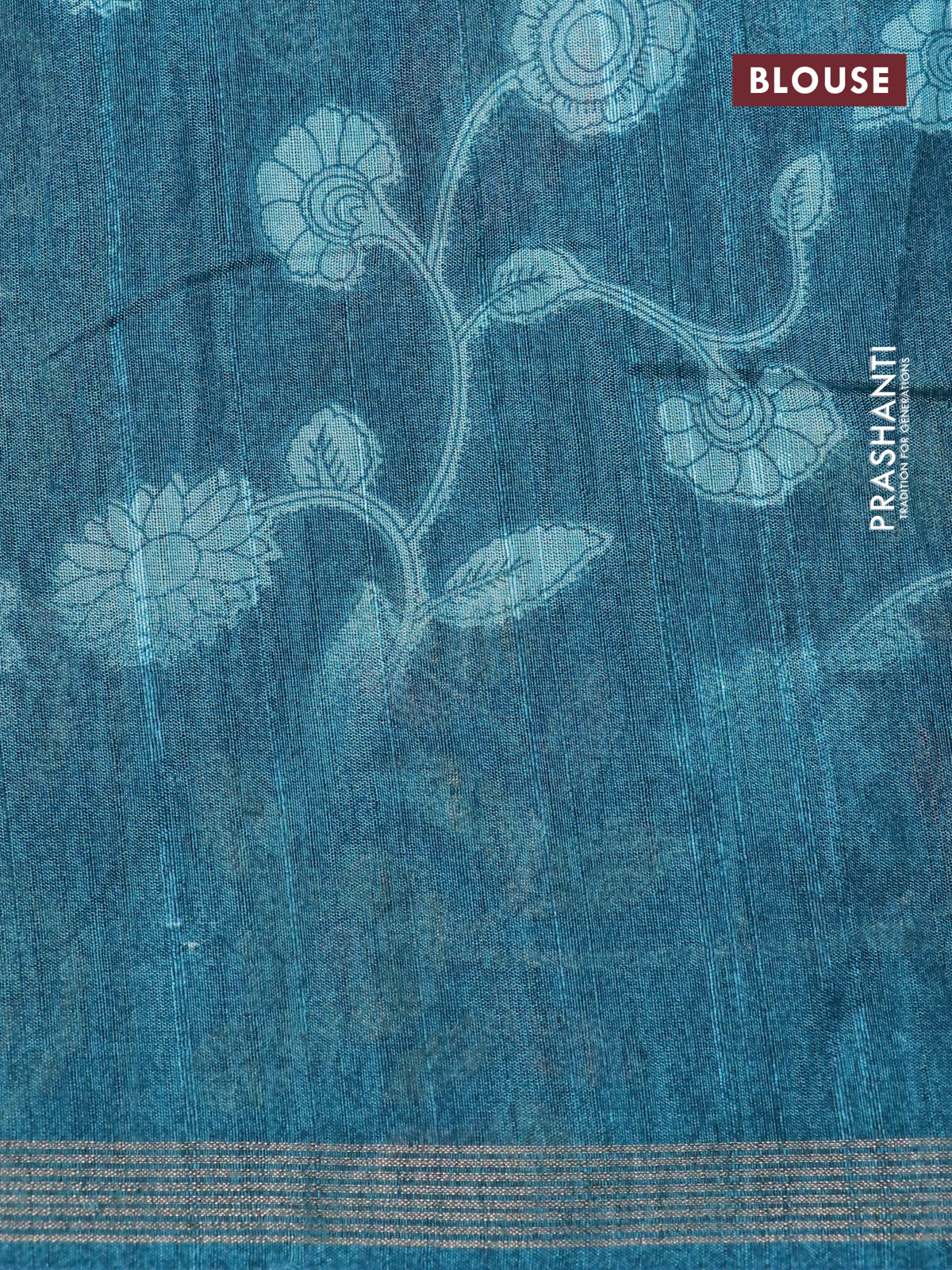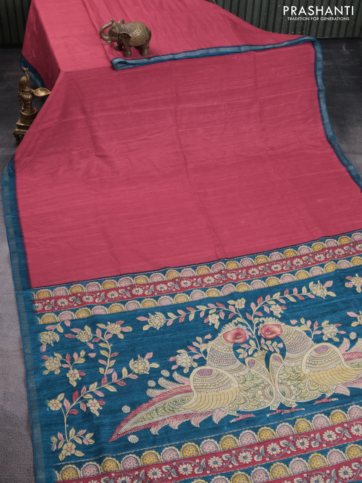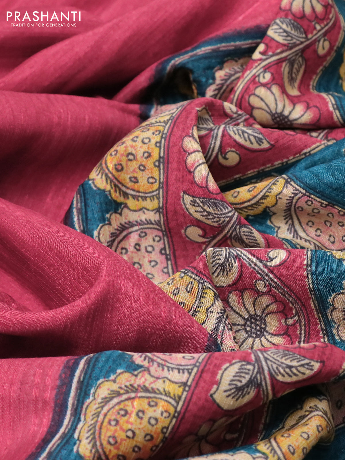 Semi tussar saree red and teal blue with plain body and kalamkari printed pallu