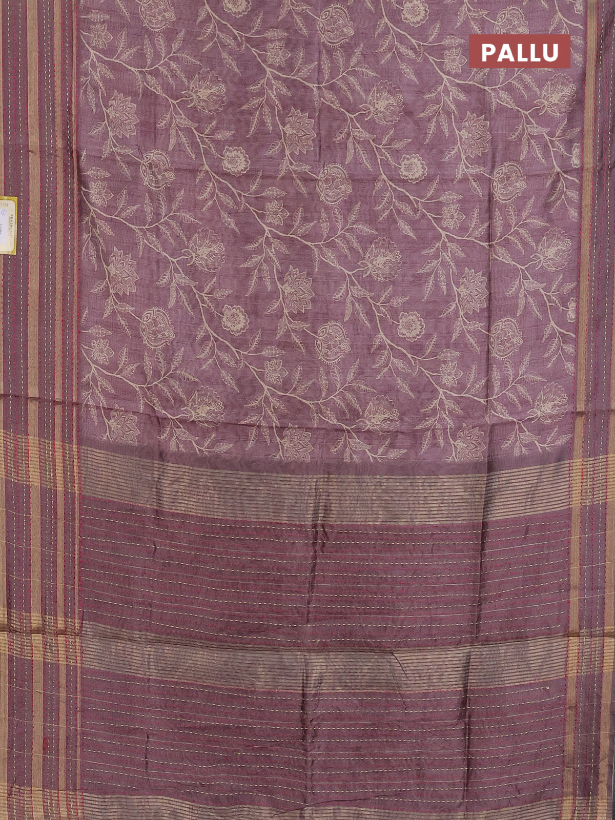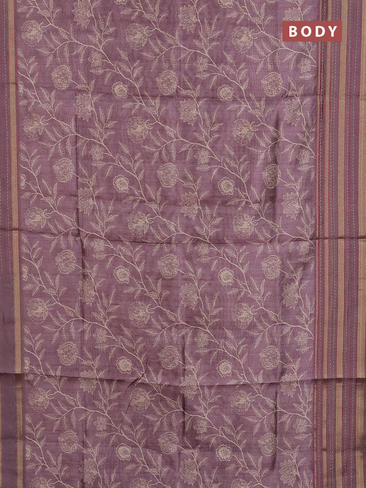 Semi tussar saree rosy brown with allover prints and kantha stitch work border