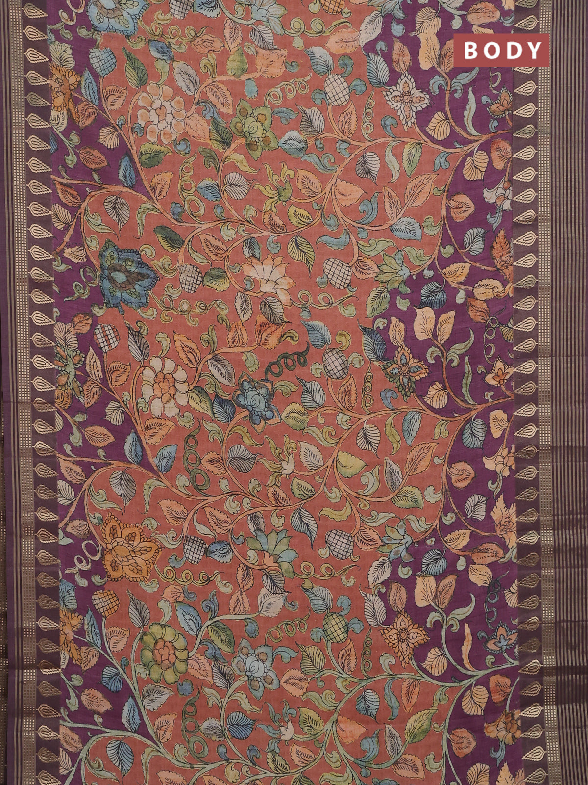 Semi tussar saree rust shade and deep wine with allover kalamkari prints and zari woven border