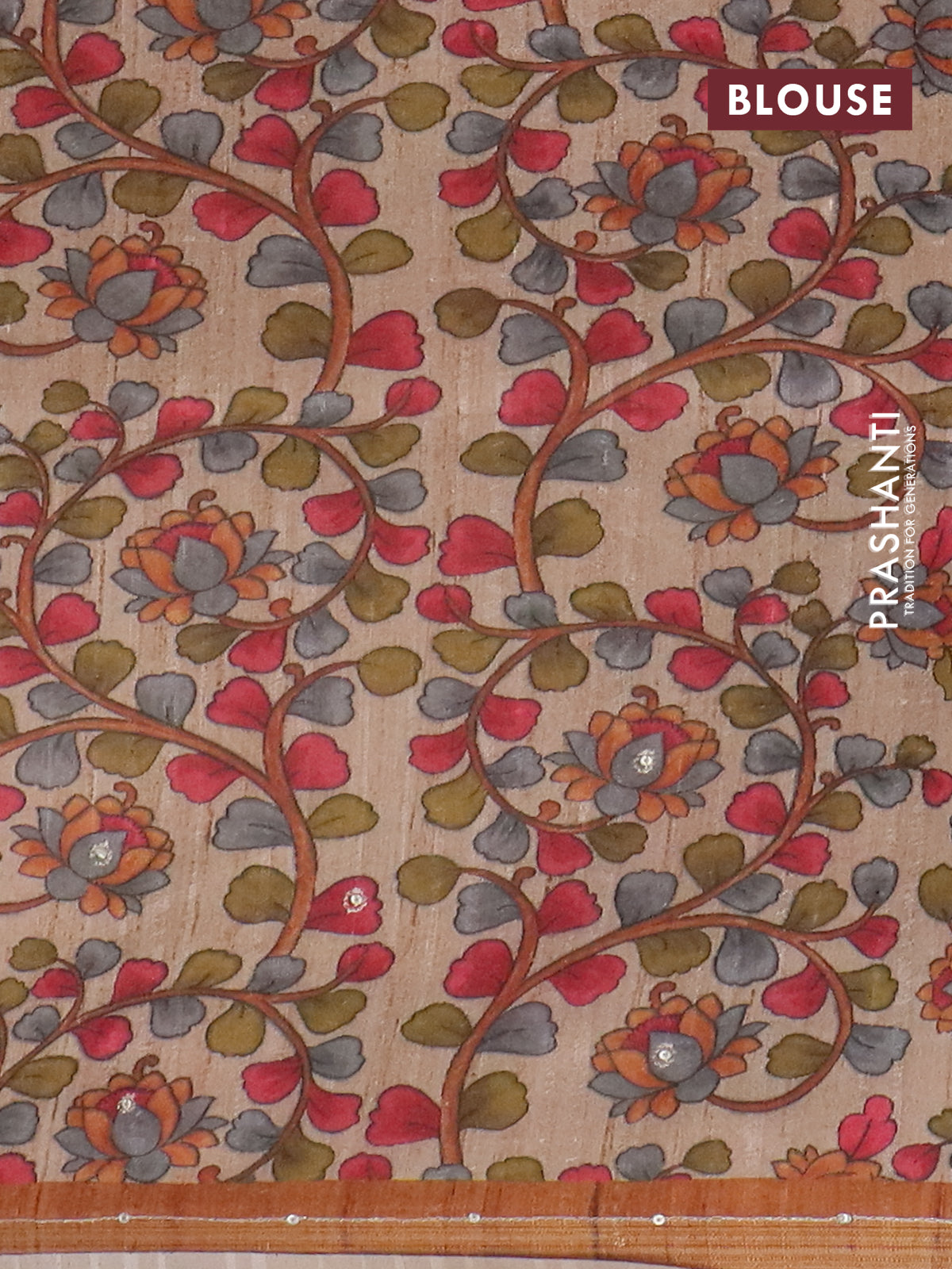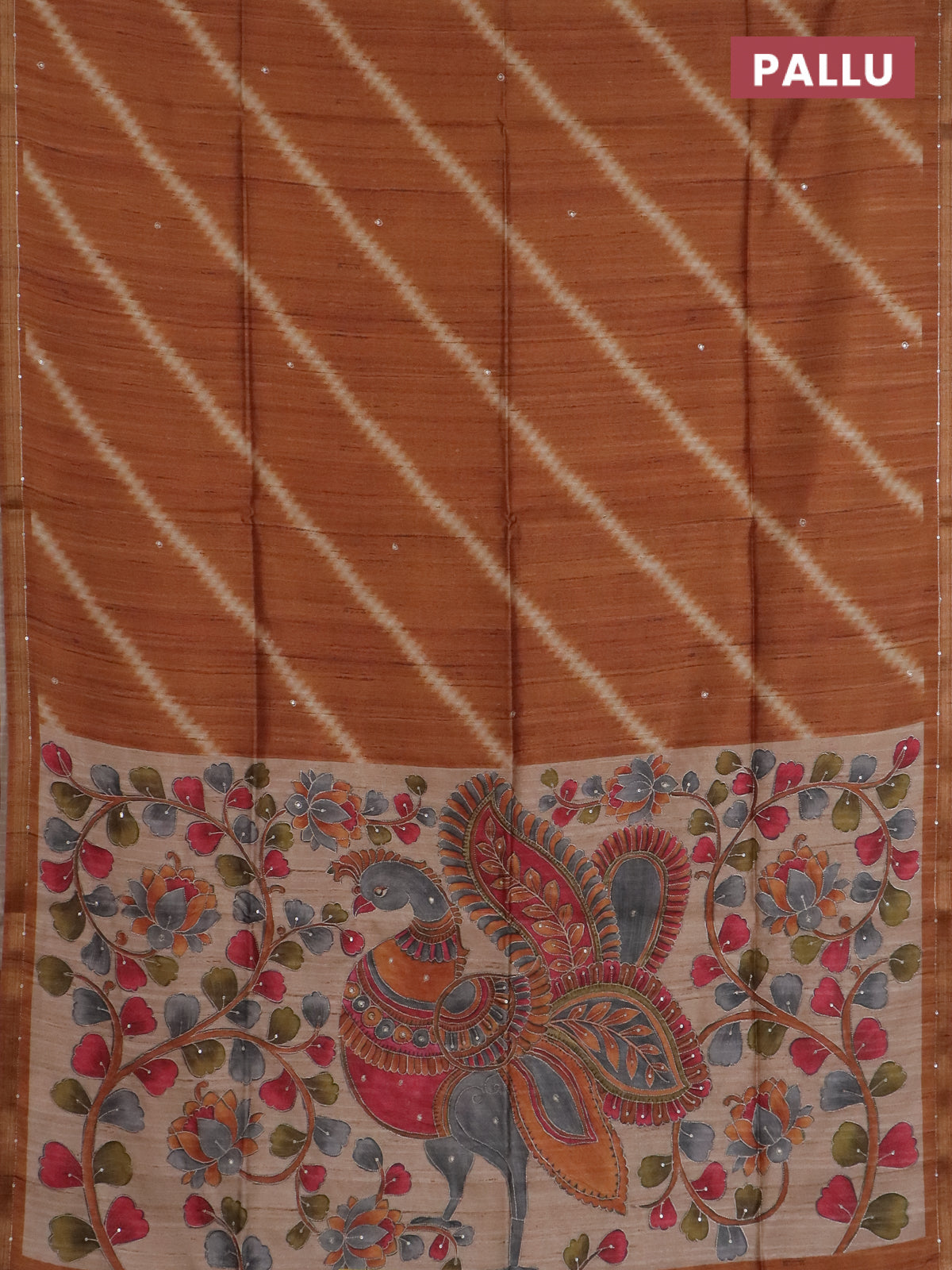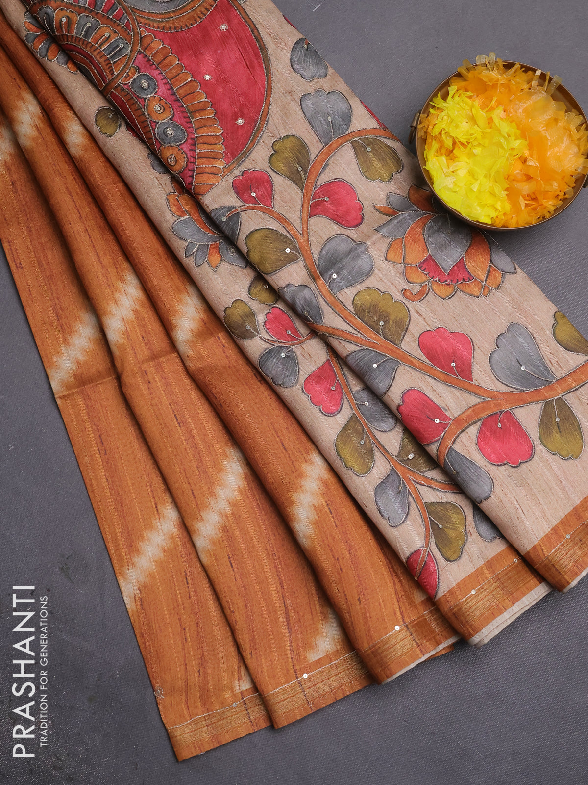 Semi tussar saree rustic orange and beige with allover leheriya prints & zari buttas and kalamkari prints & pita work pallu