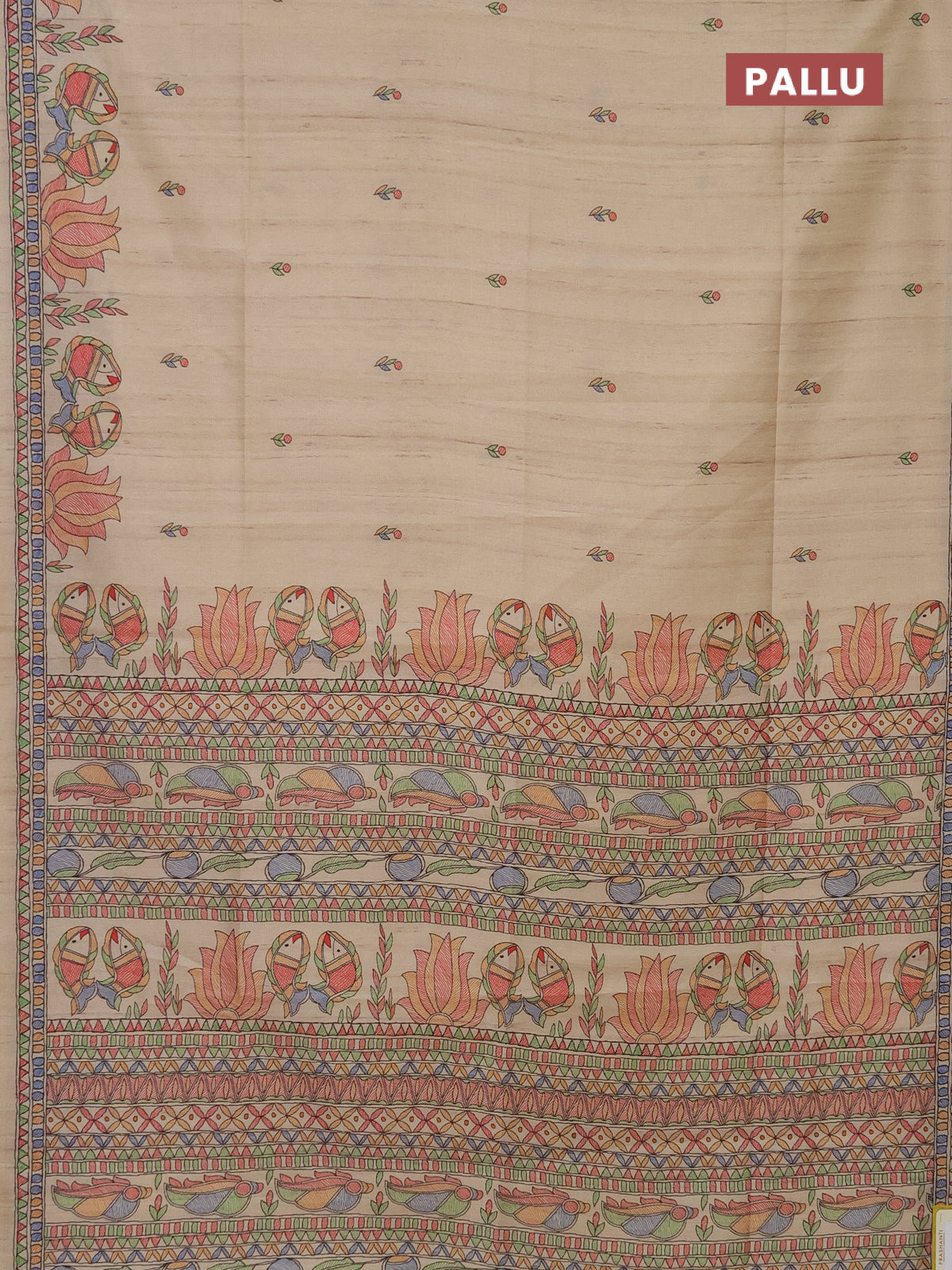Semi tussar saree sandal with butta prints and madhubani printed pallu