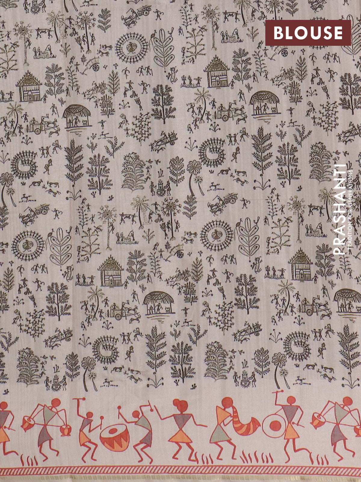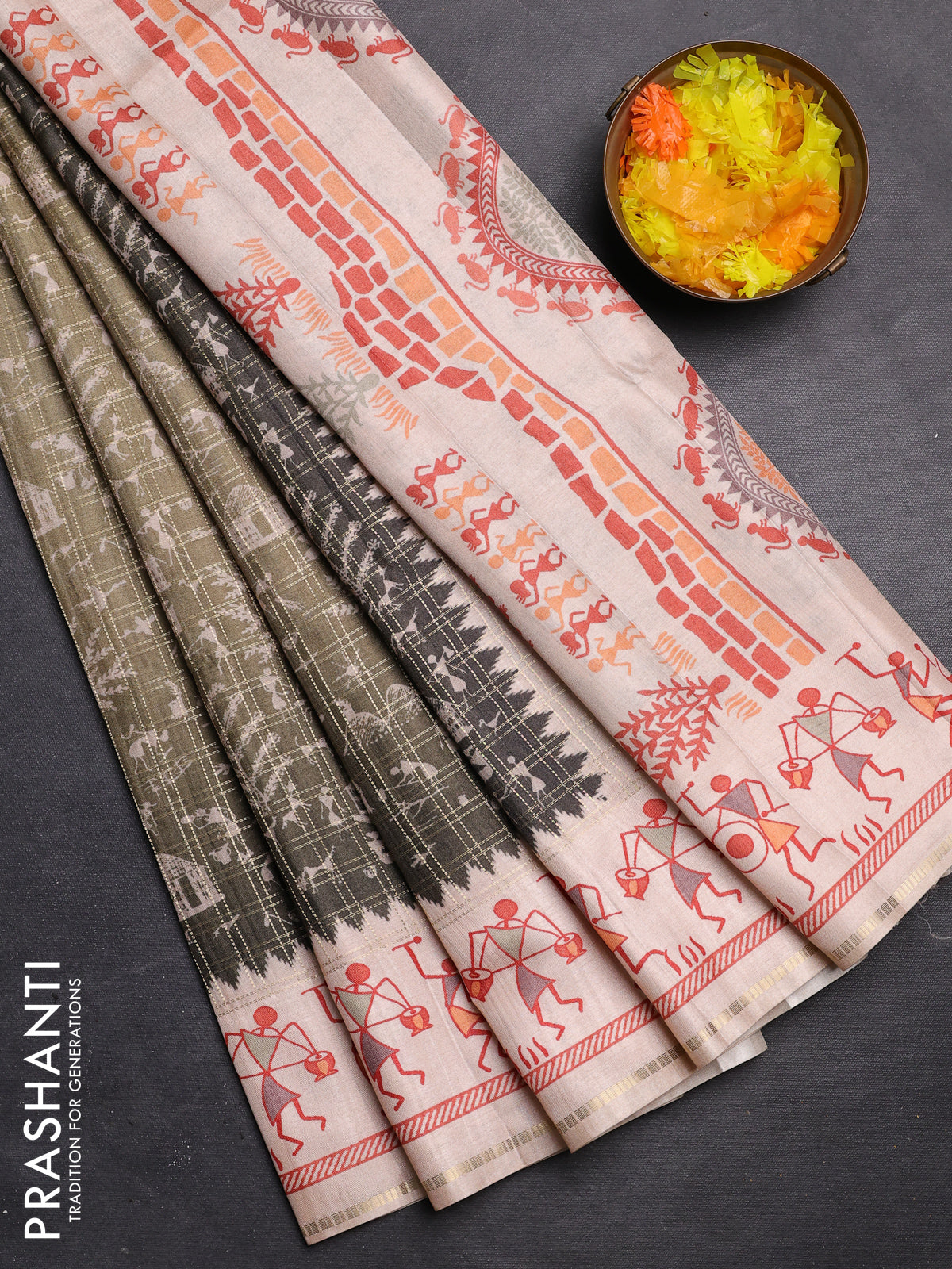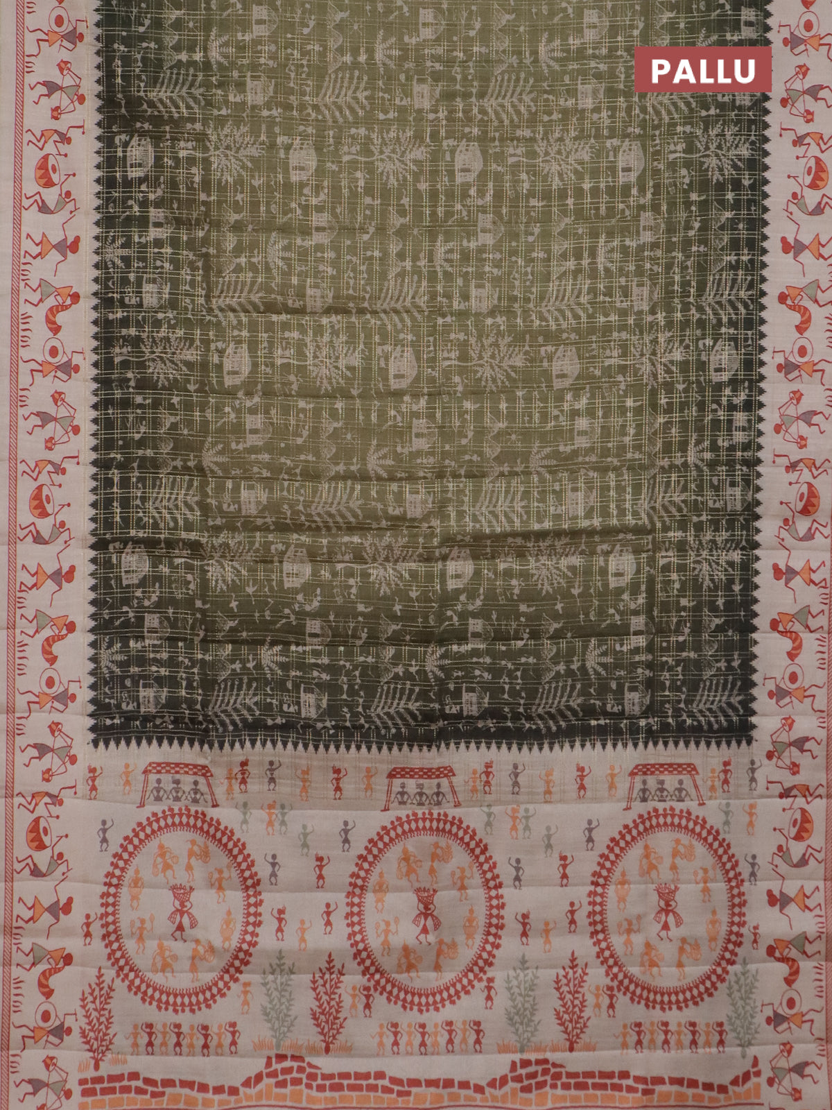 Semi tussar saree sap green and cream with allover zari checks & warli prints and printed border