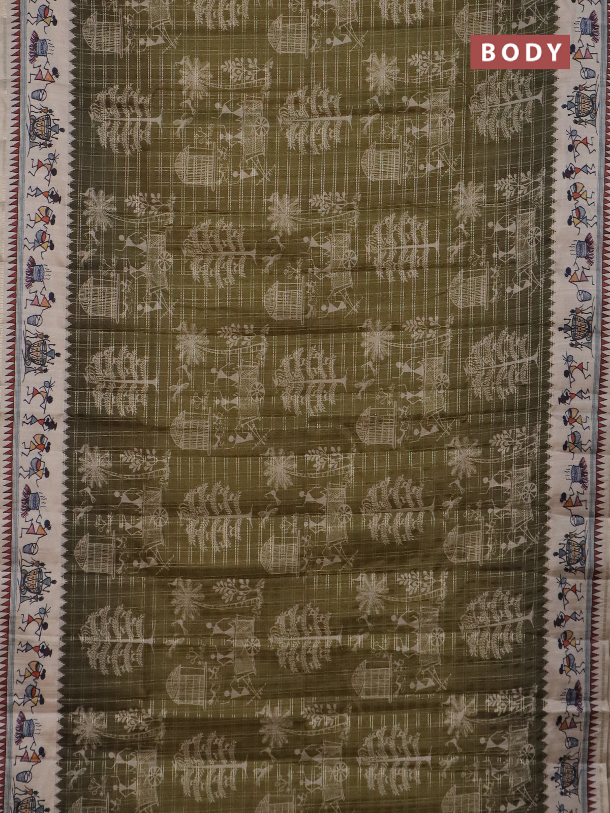 Semi tussar saree sap green and cream with allover zari checks & warli prints and printed border