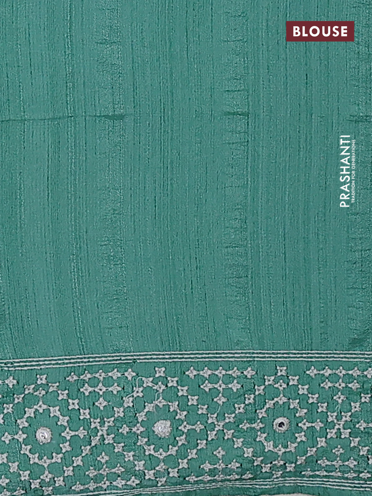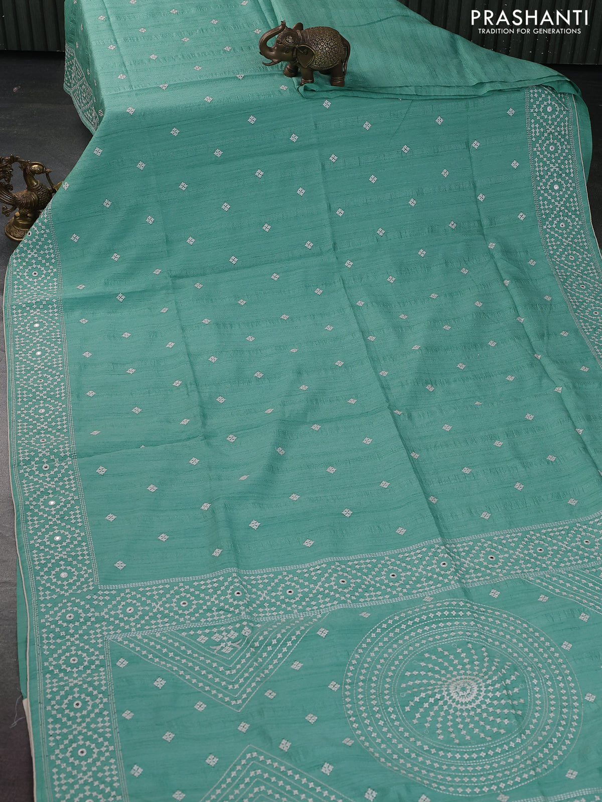 Semi tussar saree teal green and cream with embroidery work buttas and embroidery mirror work border