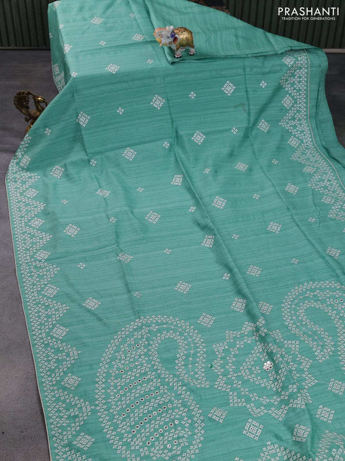 Semi tussar saree teal green and cream with embroidery work buttas and embroidery mirror work border