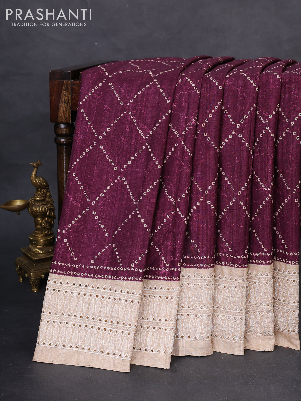 Semi tussar saree wine shade and beige with allover bandhani prints and embroidery cut work border