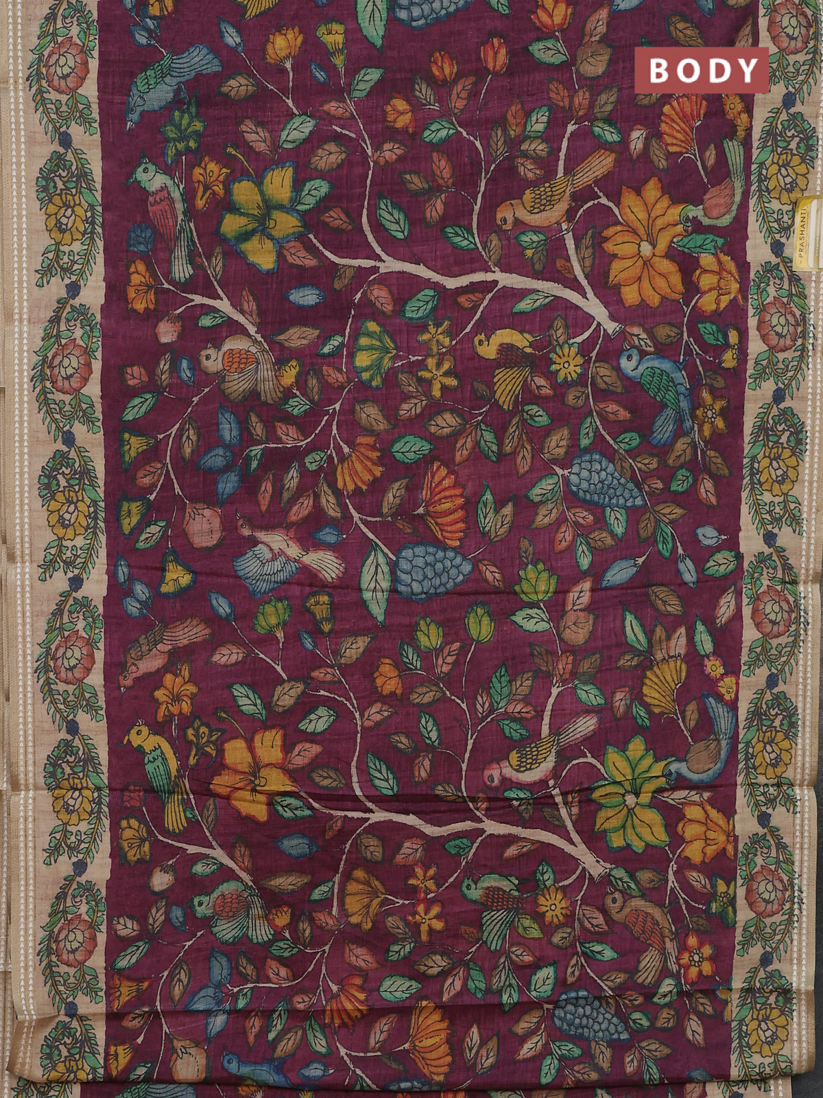 Semi tussar saree wine shade and beige with allover kalamkari prints and printed border