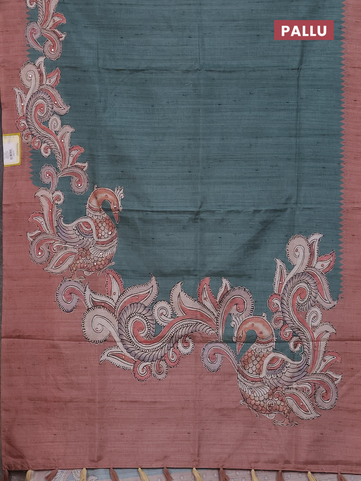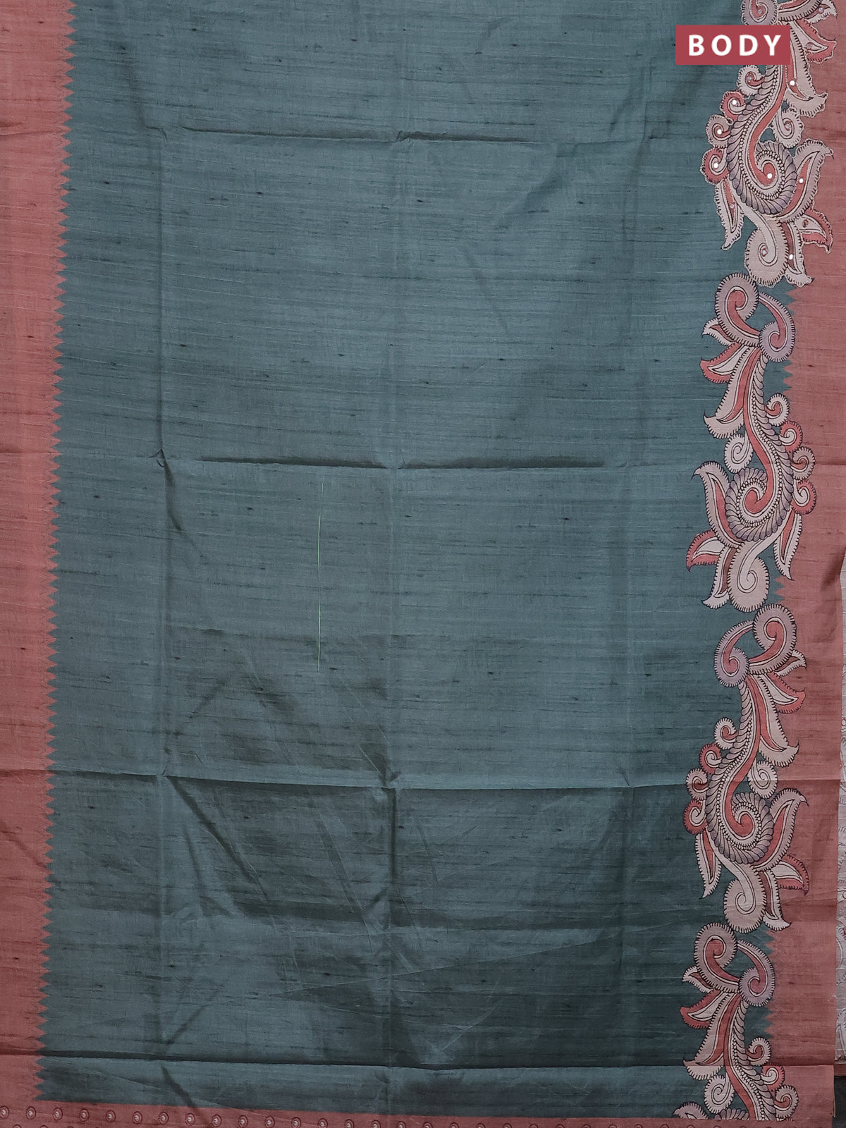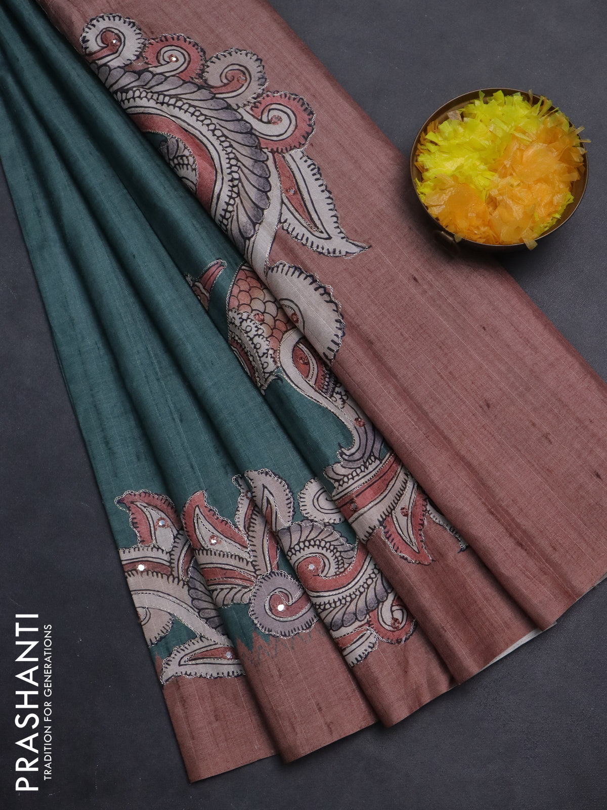 Semi tussar silk saree peacock green and brown with plain body and kalamkari prints & pita work