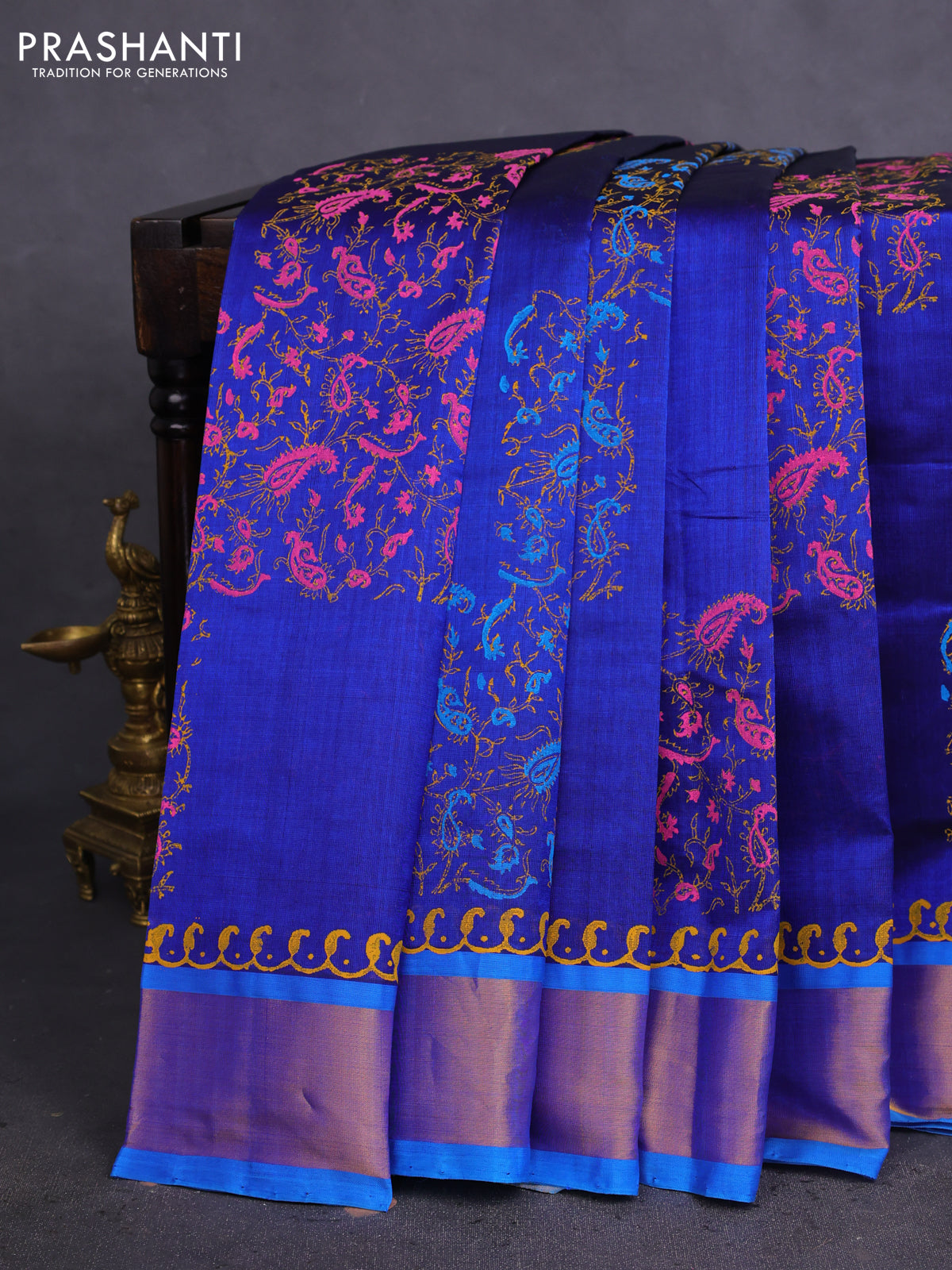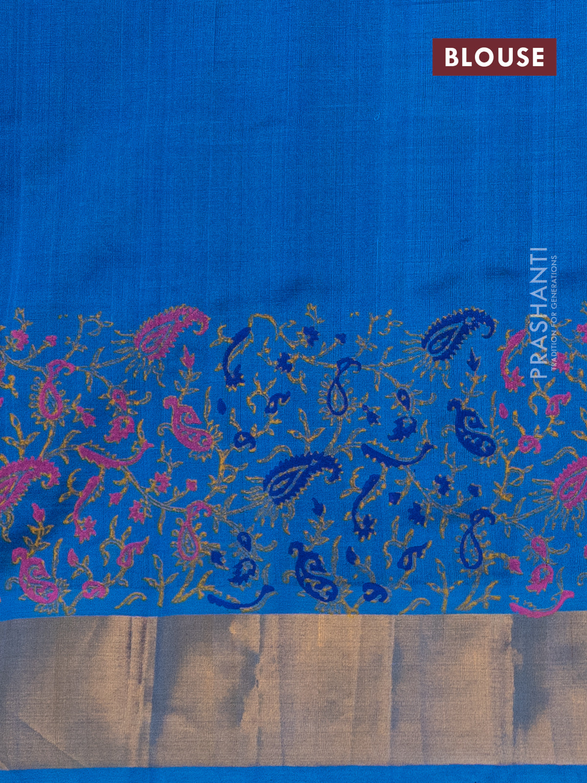 Silk cotton block printed saree blue and cs blue with allover prints and zari woven border