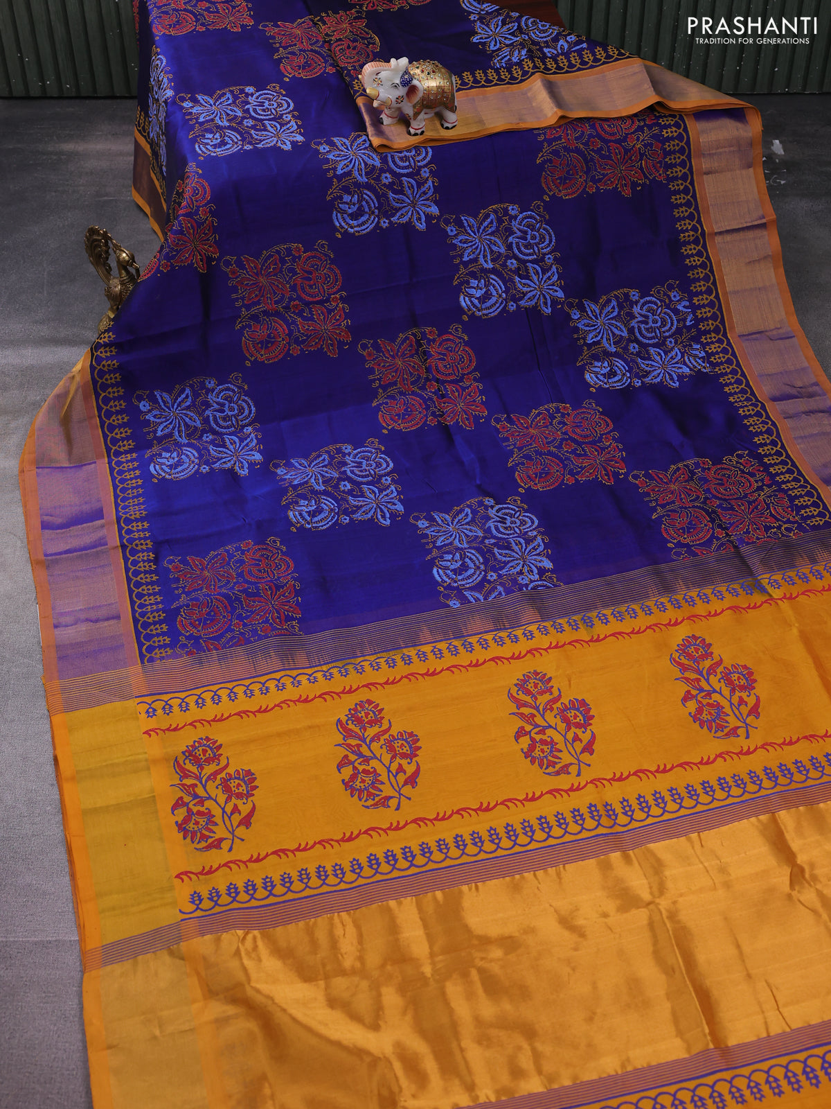 Silk cotton block printed saree blue and yellow with allover prints and zari woven border