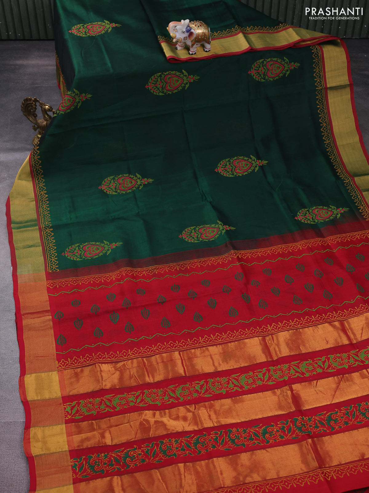 Silk cotton block printed saree bottle green and maroon with butta prints and zari woven border