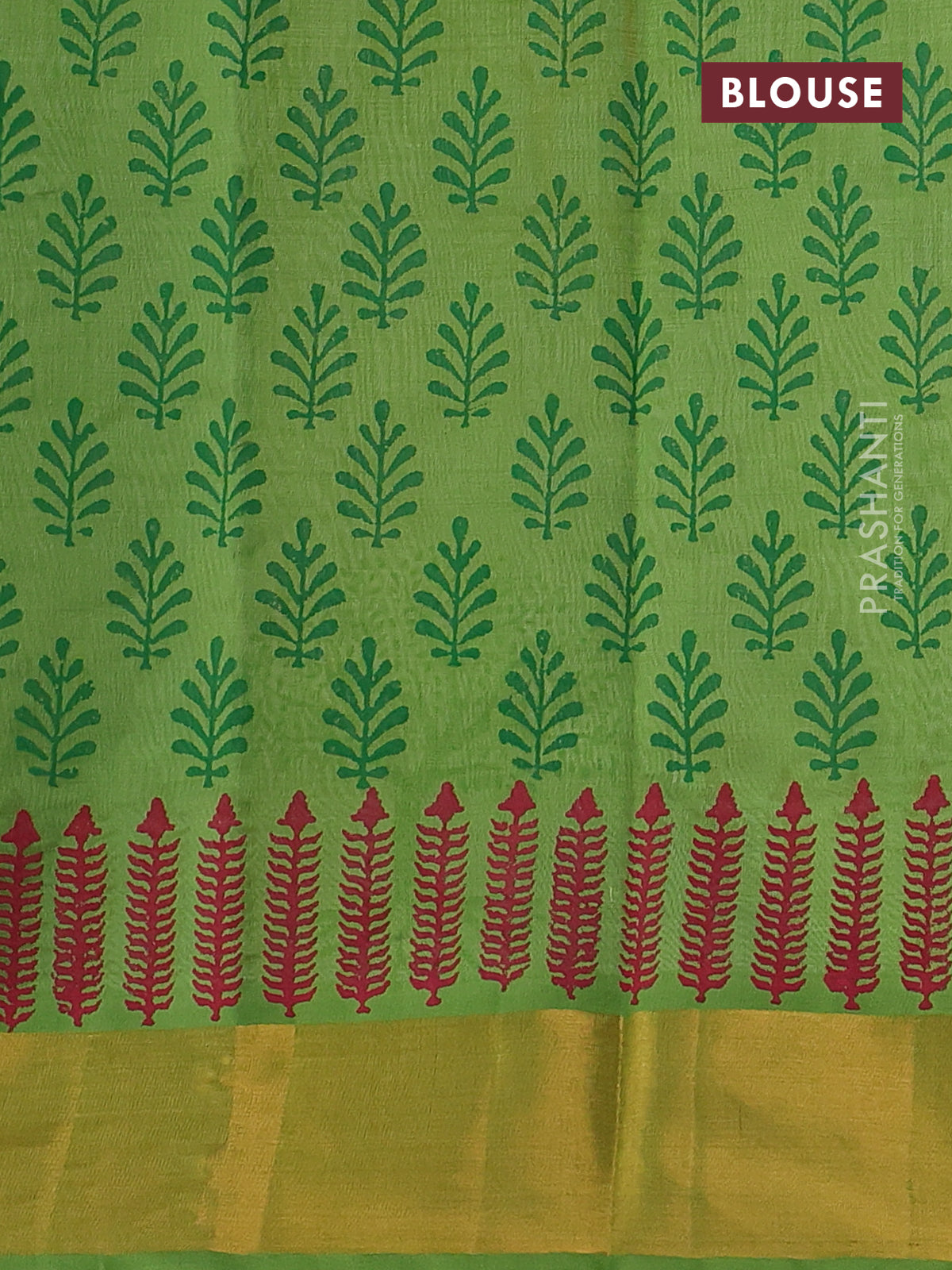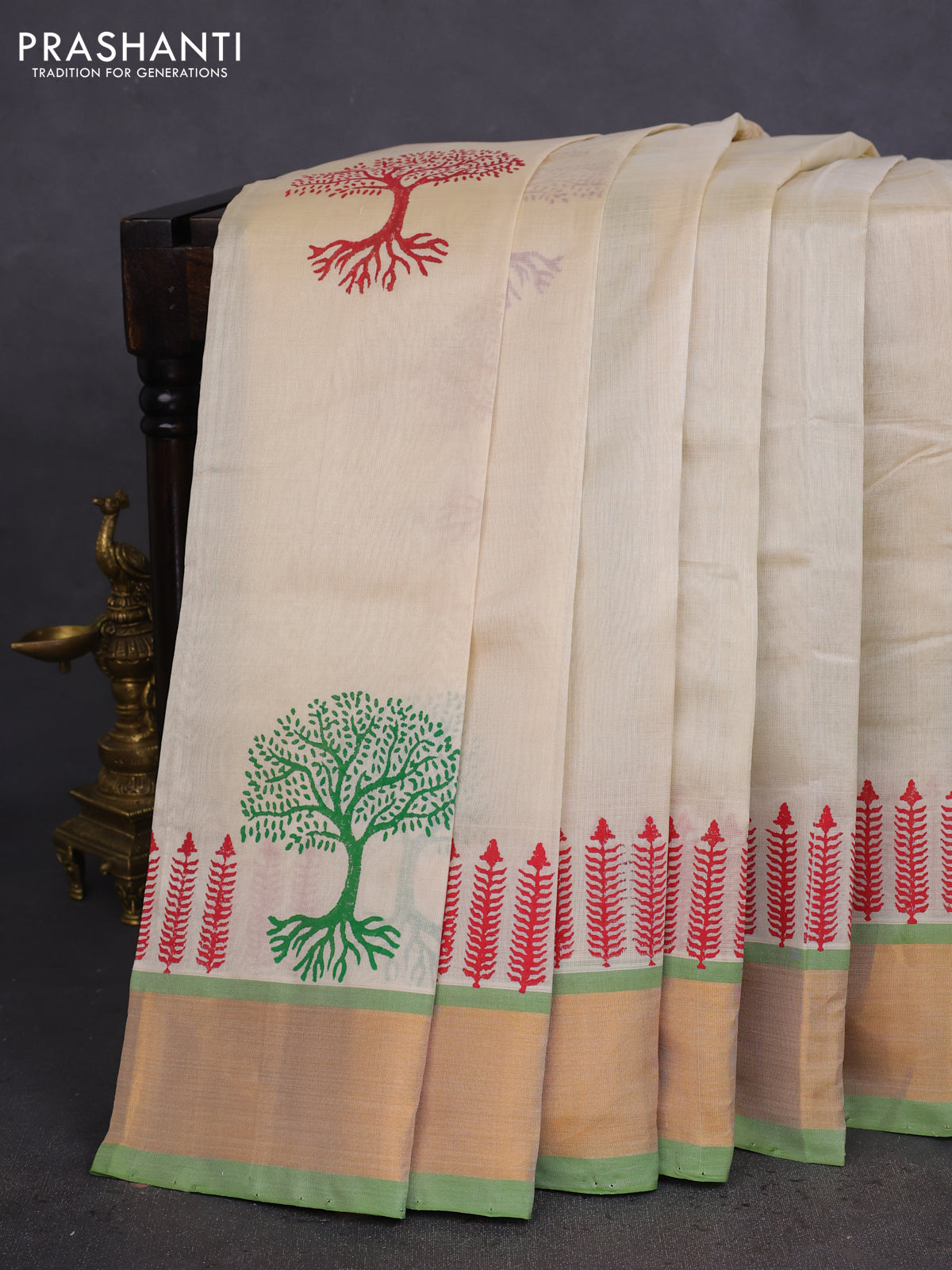 Silk cotton block printed saree cream and light green with butta prints and zari woven border