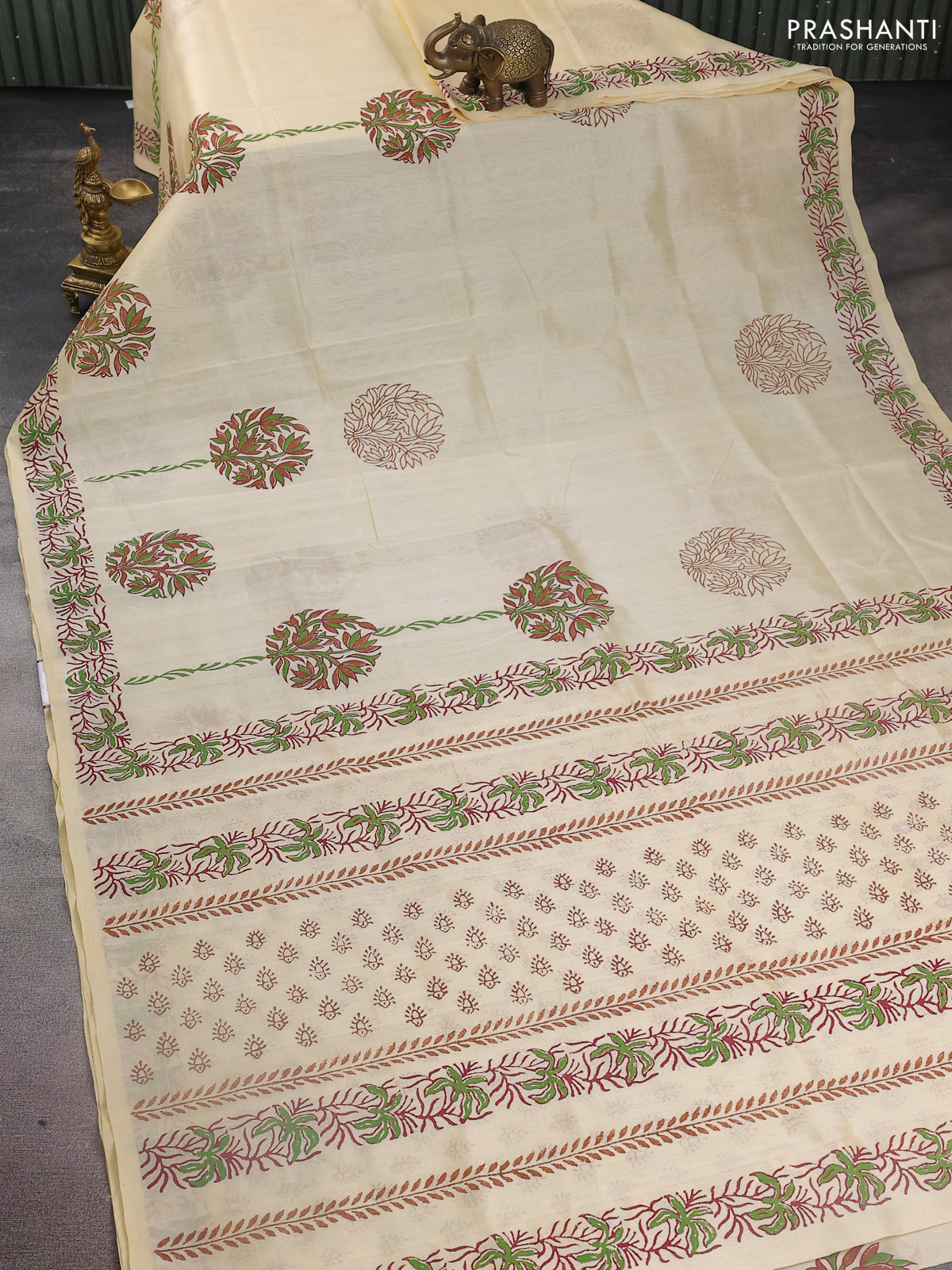 Silk cotton block printed saree cream with allover prints and printed border