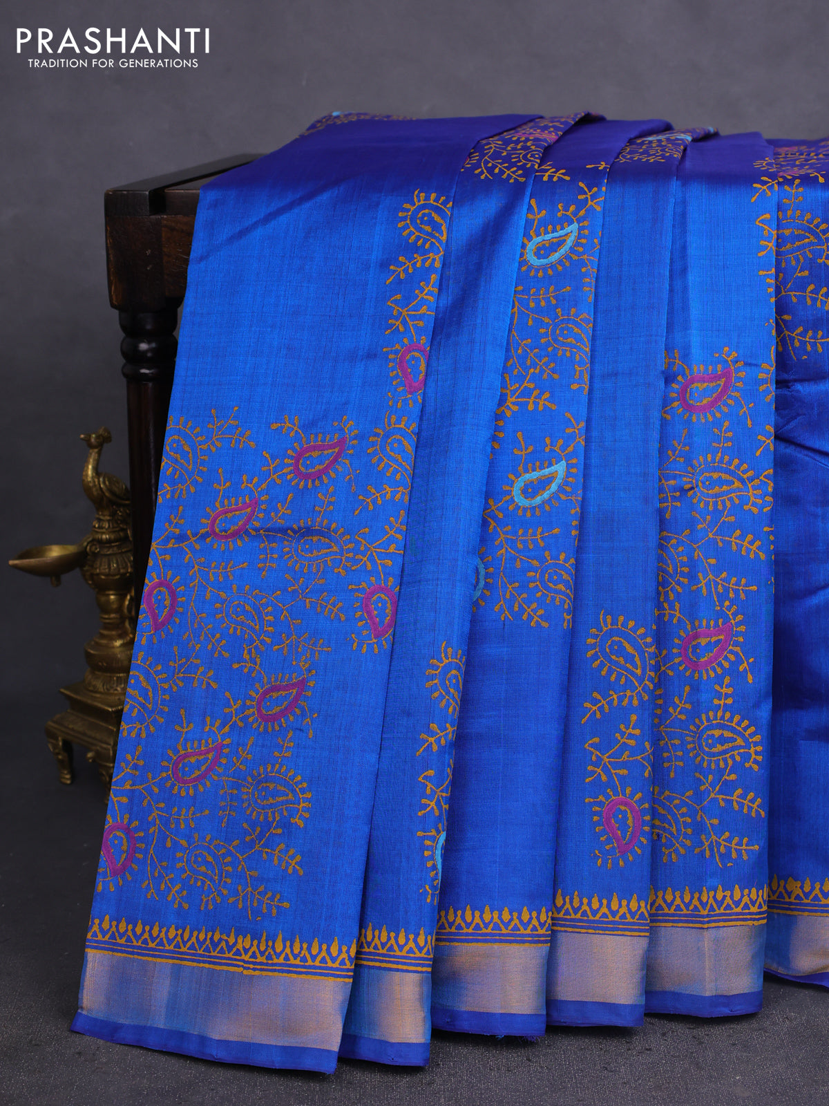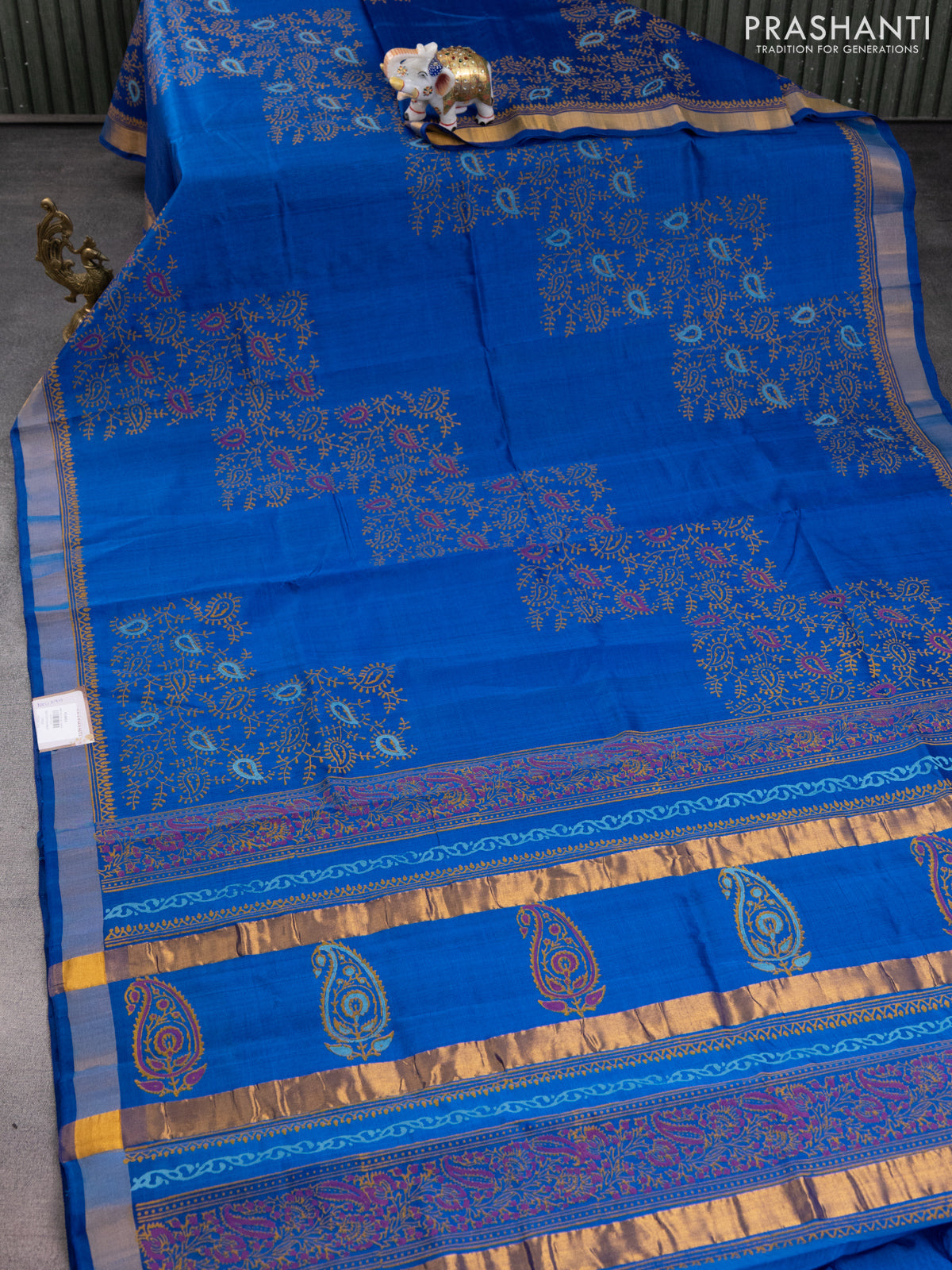 Silk cotton block printed saree cs blue with allover prints and zari woven border