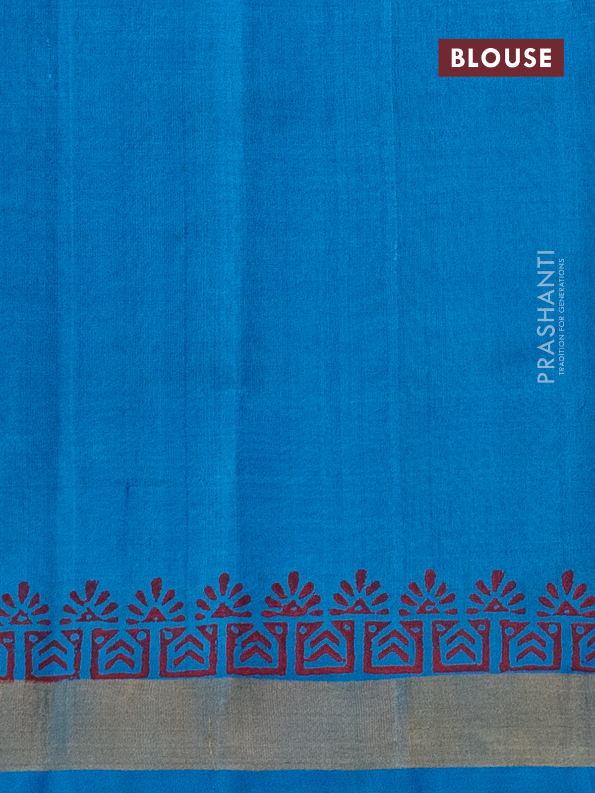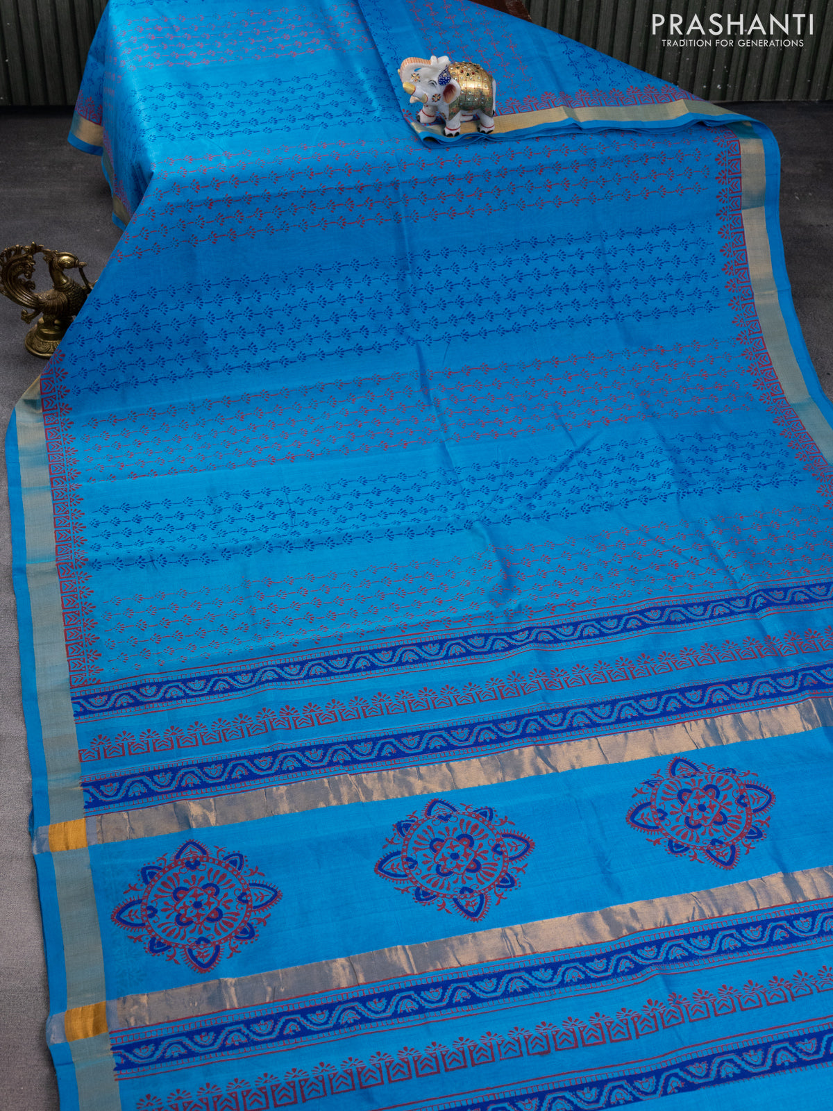 Silk cotton block printed saree cs blue with allover prints and zari woven border