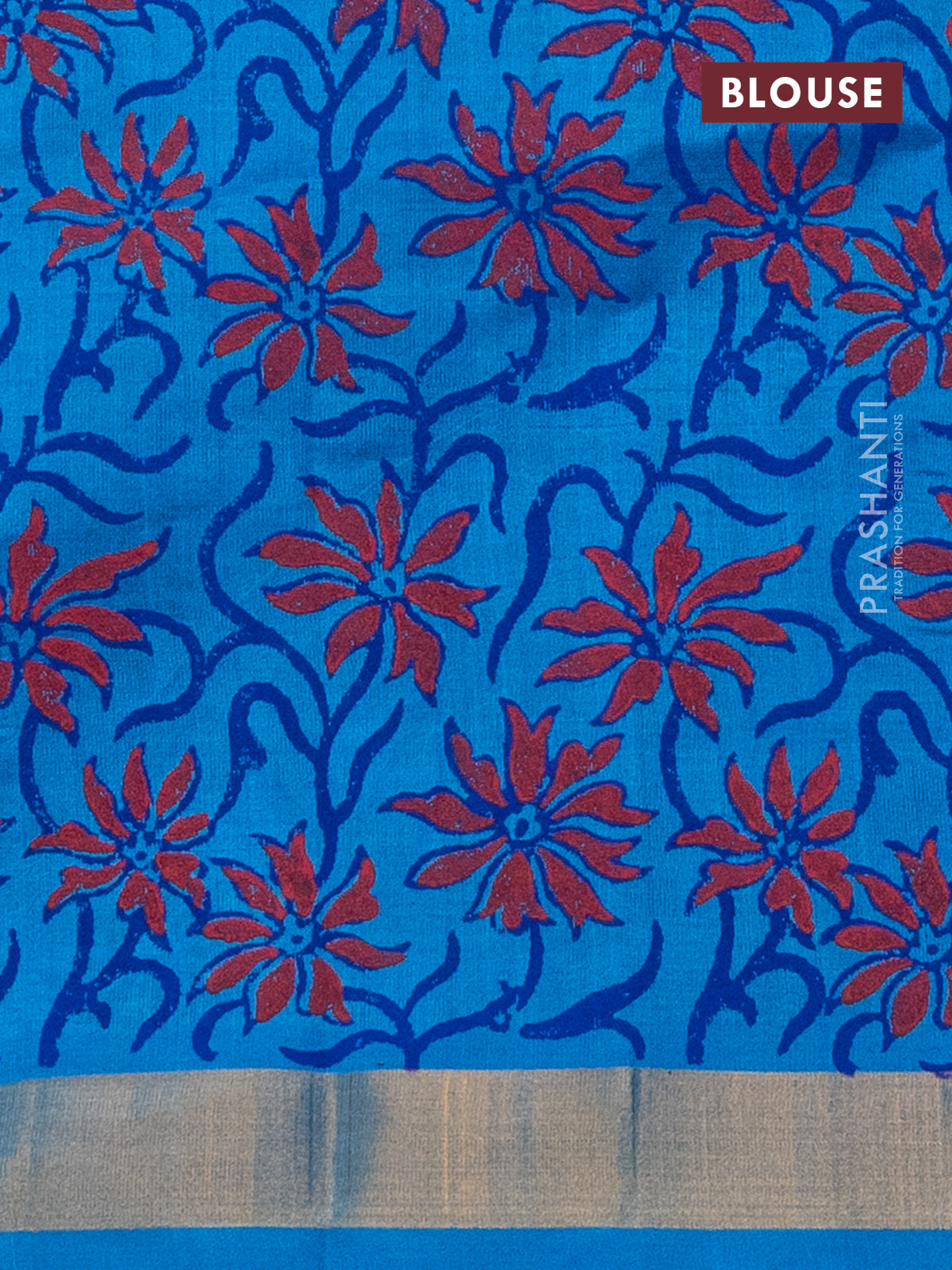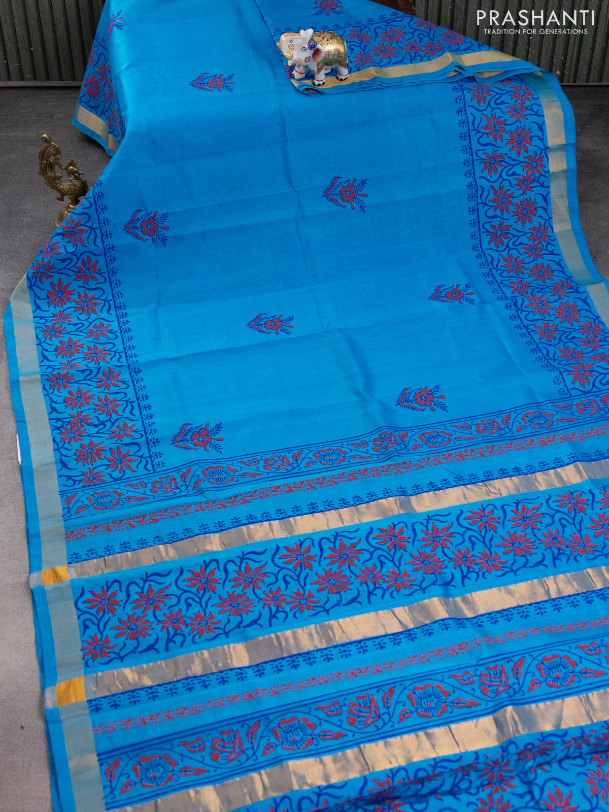 Silk cotton block printed saree cs blue with allover prints and zari woven border