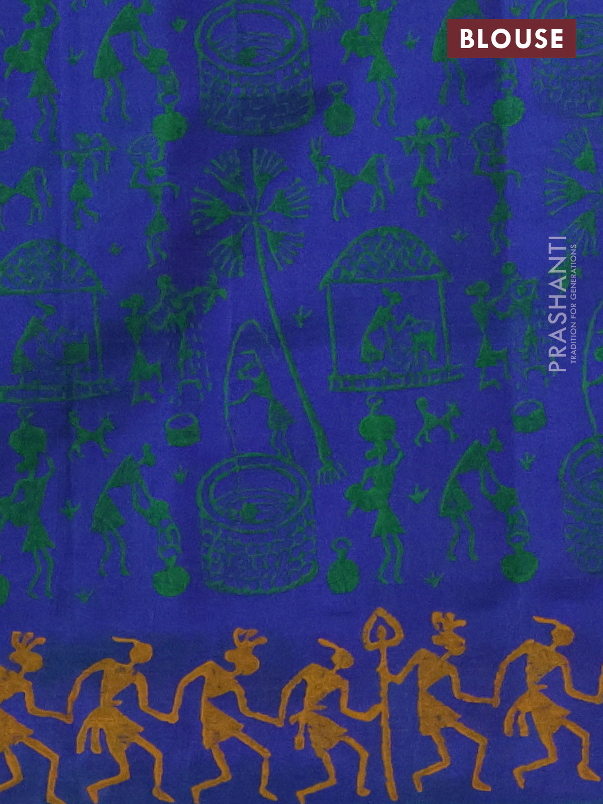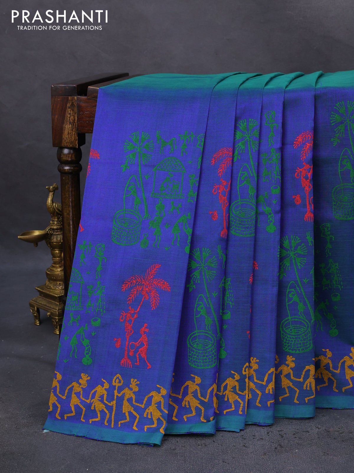 Silk cotton block printed saree dual shade of bluish green with allover warli prints and printed border