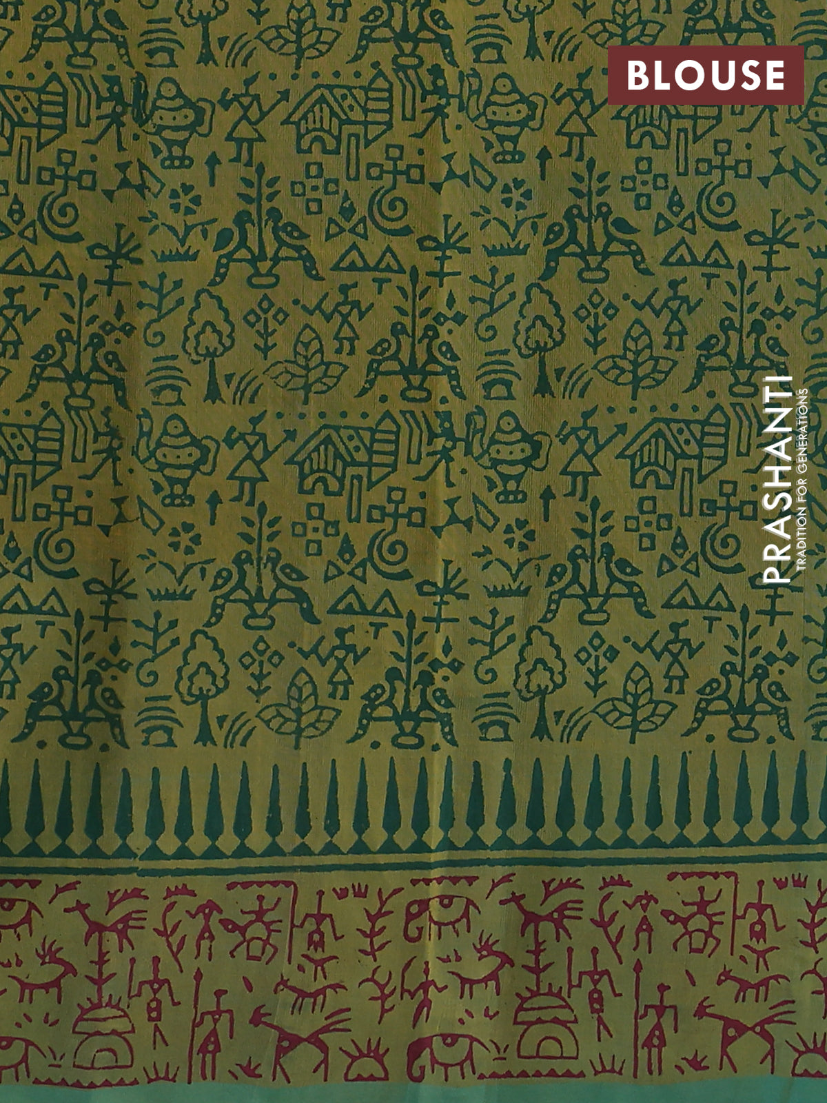 Silk cotton block printed saree dual shade of green with warli butta prints and printed border