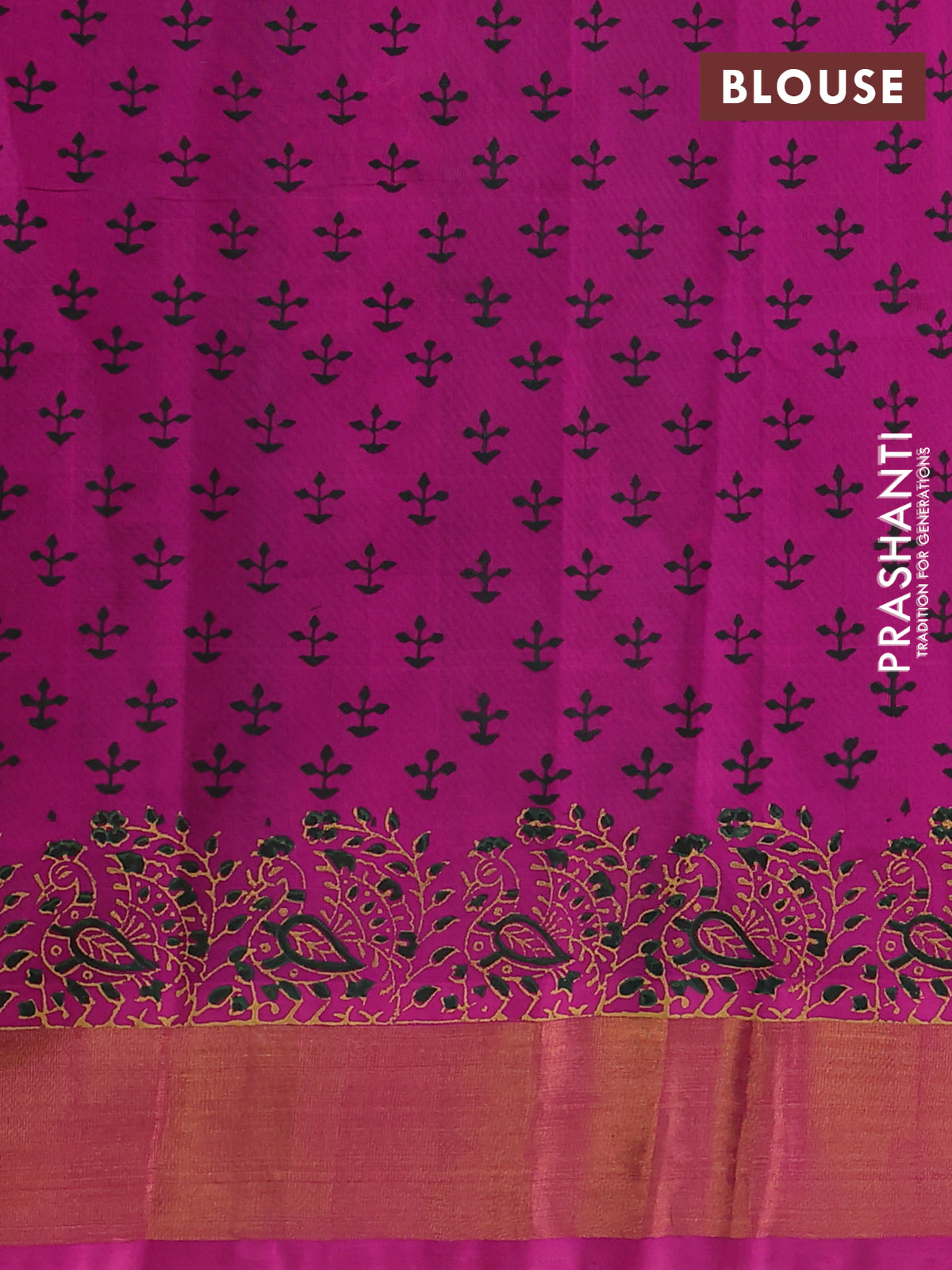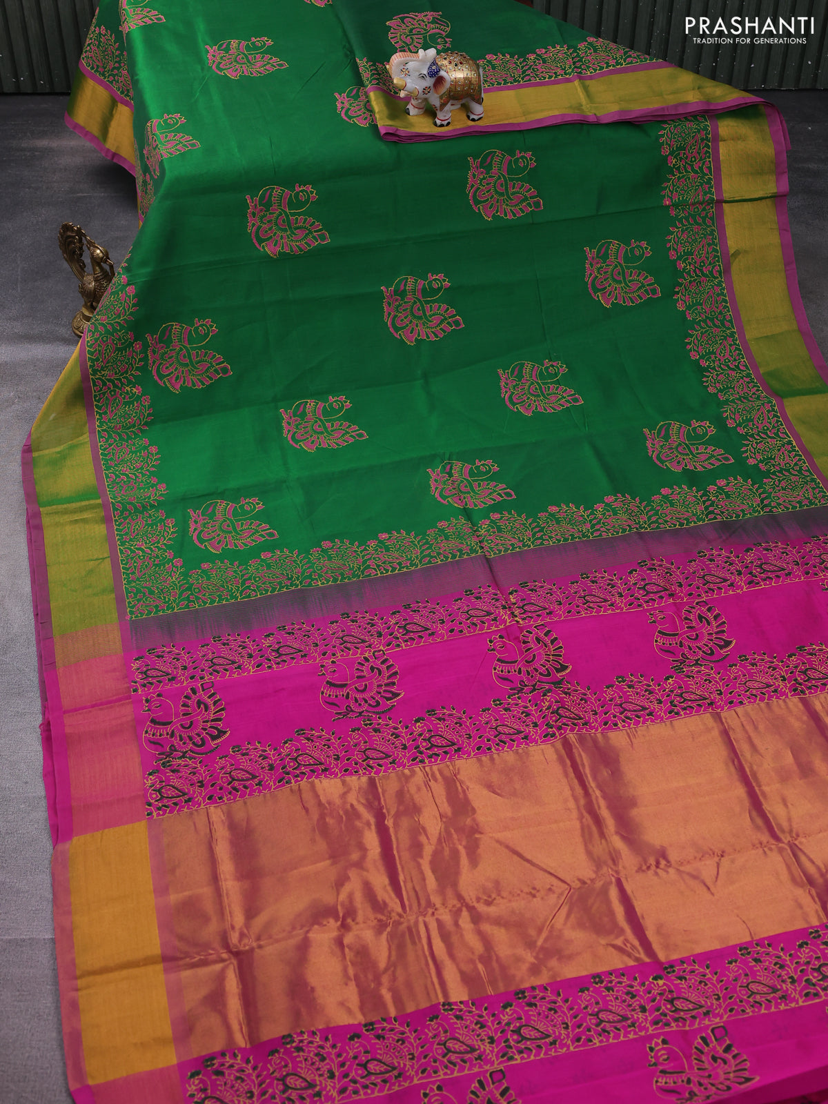 Silk cotton block printed saree green and pink with annam butta prints and zari woven border