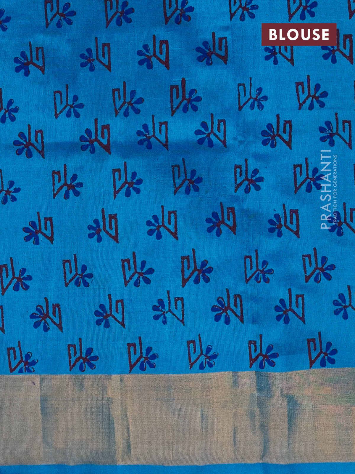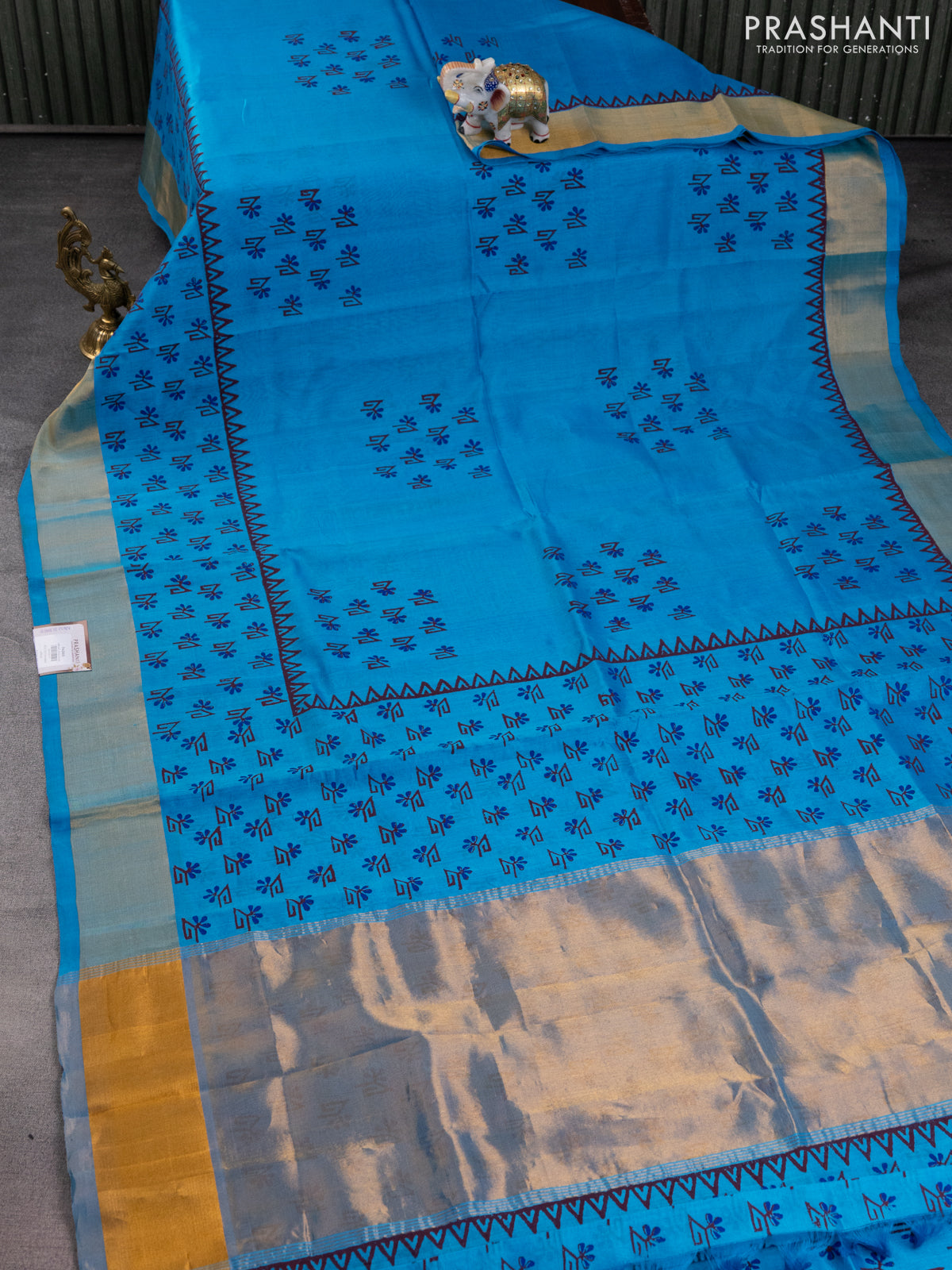 Silk cotton block printed saree light blue with allover butta prints and zari woven border