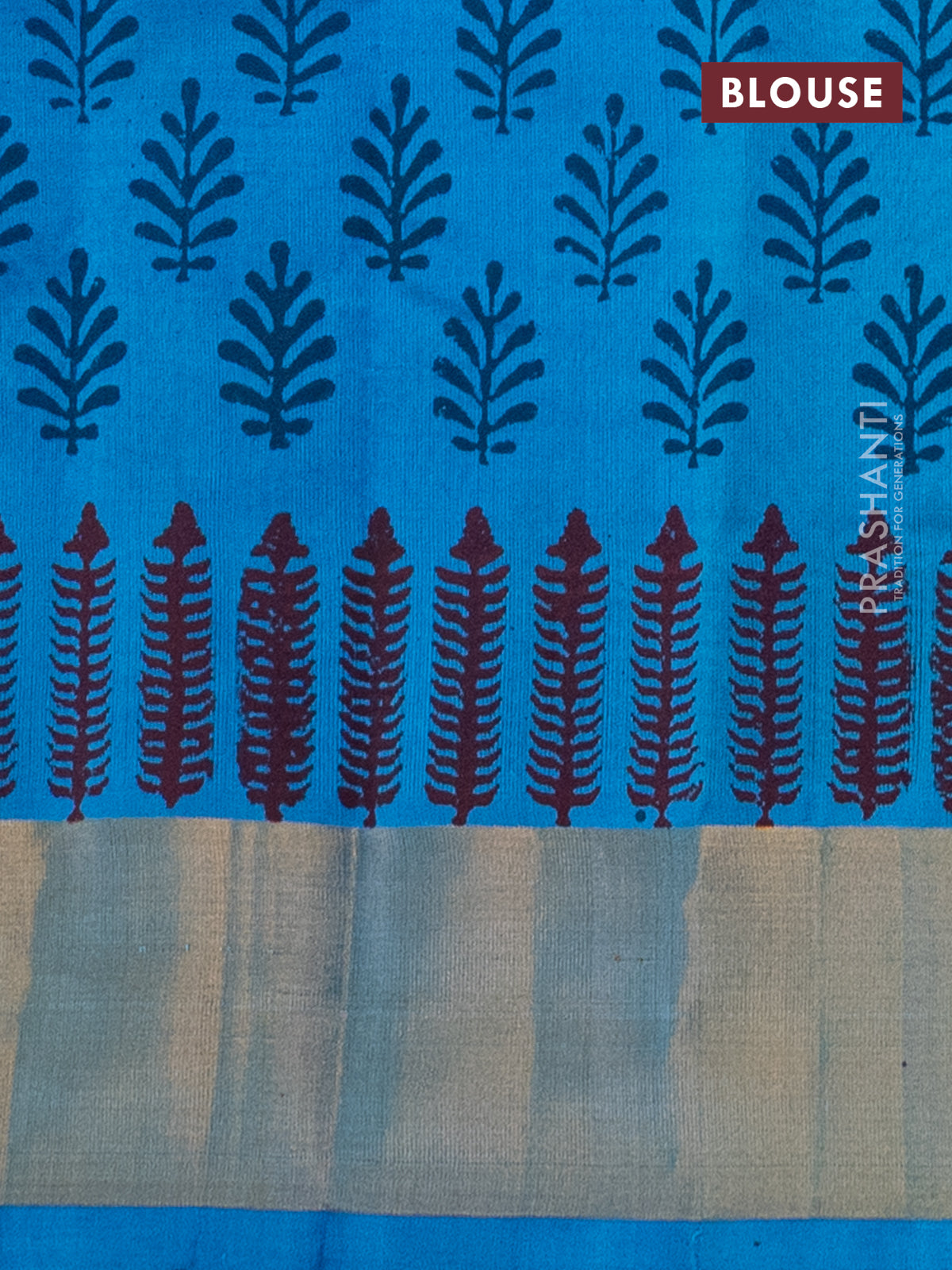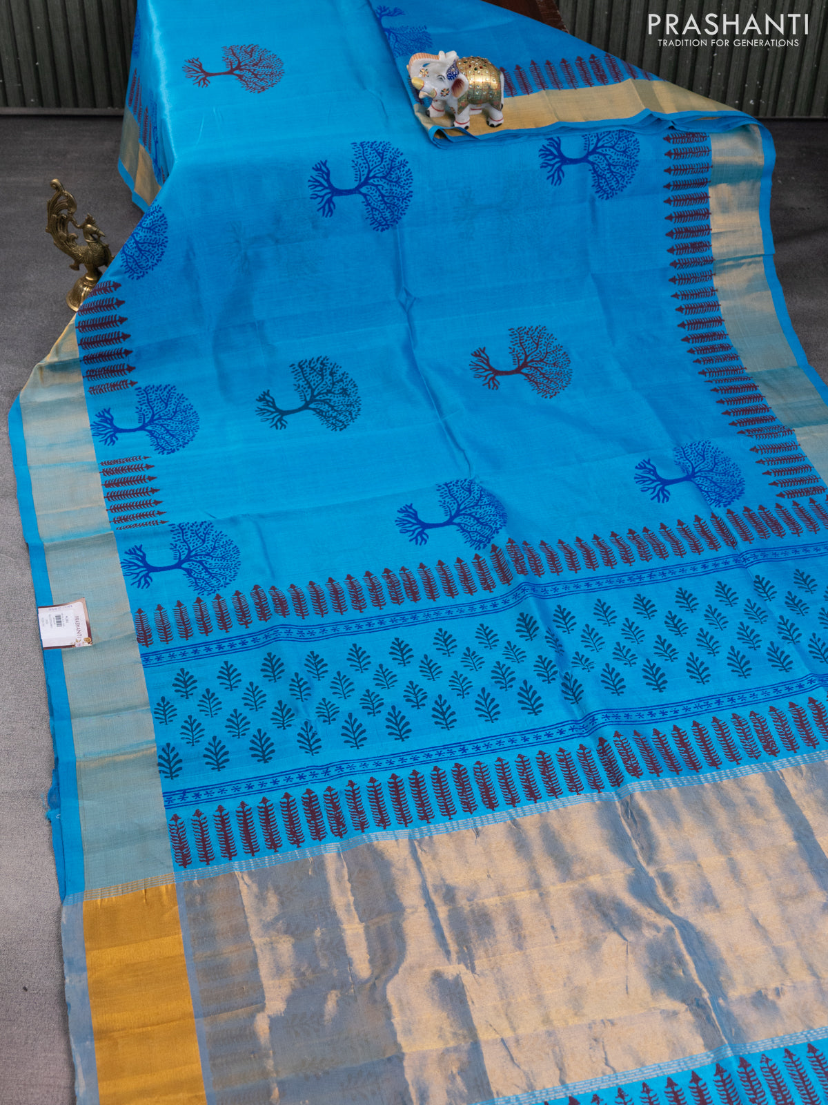 Silk cotton block printed saree light blue with allover prints and zari woven border